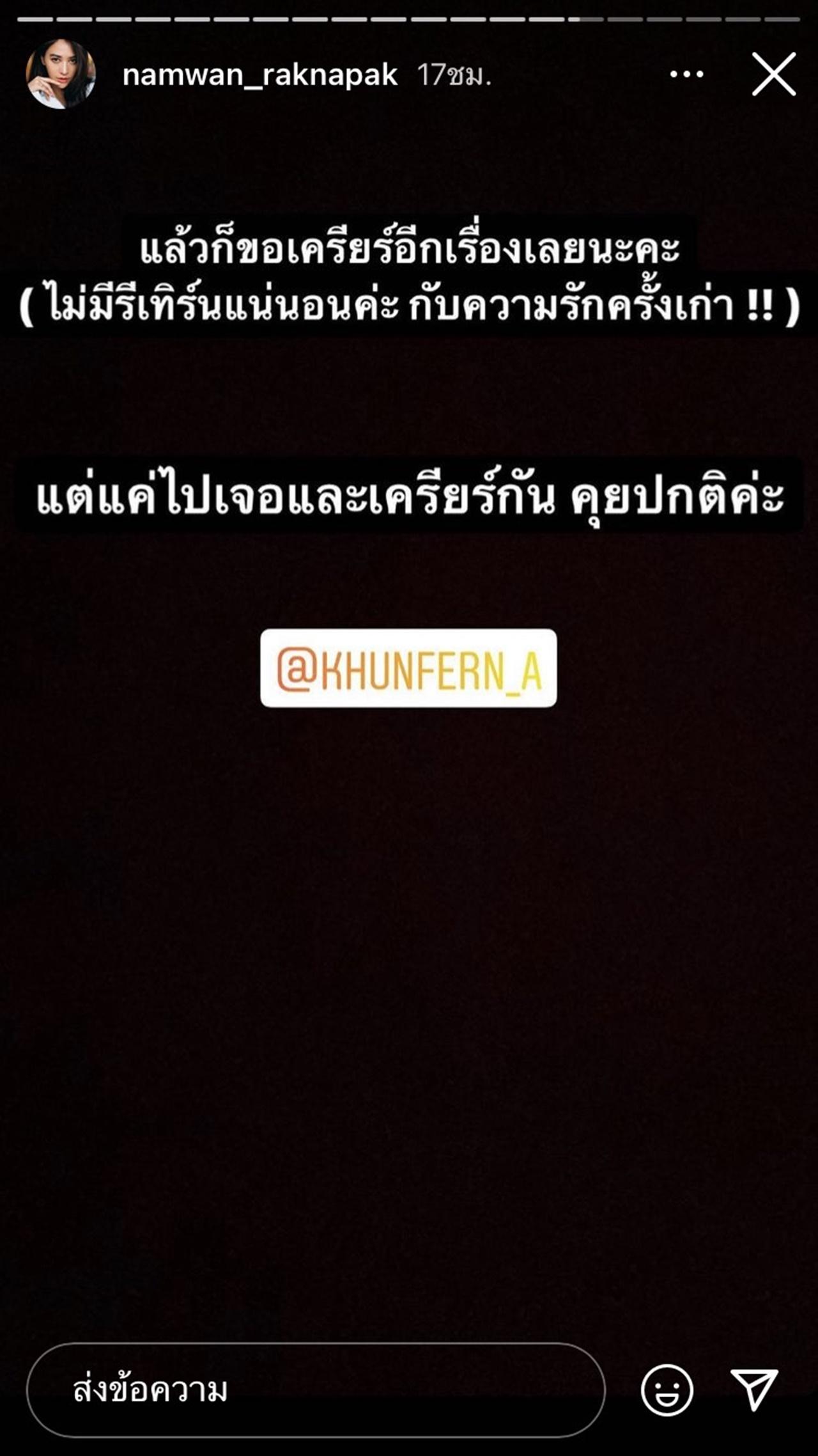 และจากเรื่องนี้เอง น้ำหวาน ก็ได้ออกมาชี้แจงผ่านไอจีสตอรี่ โดยบอกว่า "ขอเคลียร์อีกเรื่องเลยนะคะ (ไม่มีรีเทิร์นแน่นอนค่ะ กับความรักครั้งเก่า) แต่แค่ไปเจอและเคลียร์กัน คุยกันปกติค่ะ"