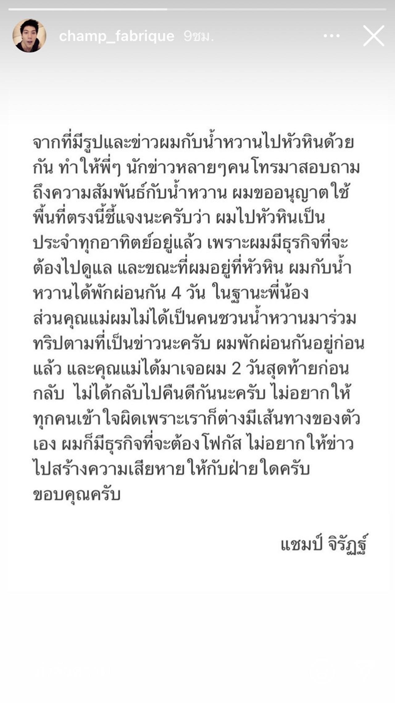 "จากที่มีรูปและข่าวผมกับน้ำหวานไปหัวหินด้วยกัน ทำให้พี่ๆ นักข่าวหลายๆ คนโทรมาสอบถามถึงความสัมพันธ์กับน้ำหวาน ผมขออนุญาตใช้พื้นที่ตรงนี้ชี้แจงนะครับว่า ผมไปหัวหินเป็นประจำทุกอาทิตย์อยู่แล้ว เพราะผมมีธุรกิจที่จะต้องไปดูแล และขณะที่ผมอยู่ที่หัวหิน