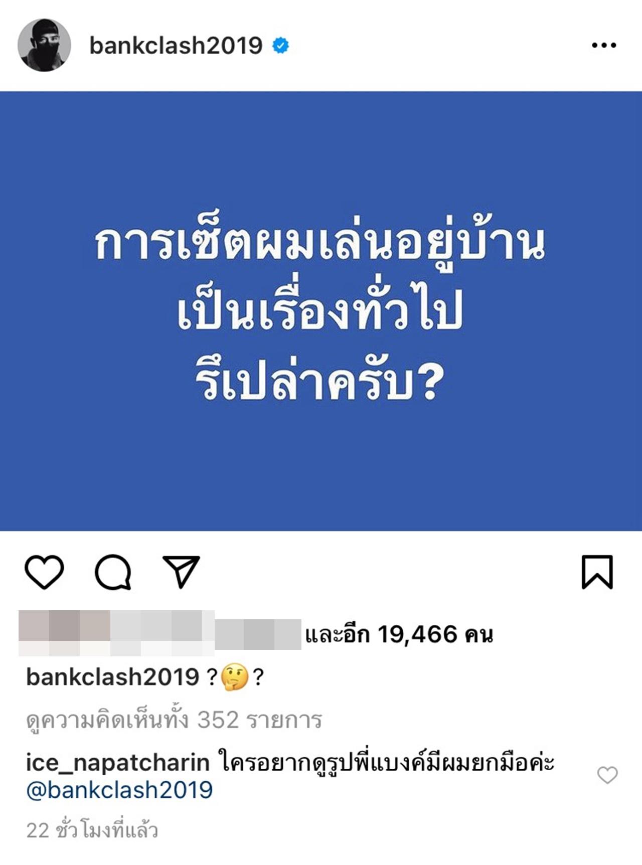 และดูเหมือนจะเป็นการตอกย้ำว่า ผมของแบงค์ เริ่มยาวแล้วจริงๆ โดยเจ้าตัวได้โพสต์ข้อความแนวเชิงตั้งคำถามว่า "การเซตผมอยู่บ้าน เป็นเรื่องทั่วไปหรือเปล่าครับ" ซึ่งแฟนๆ ที่ติดตามต่างก็เข้ามาคอมเมนต์กันเป็นจำนวนมาก อาทิ "ใครอยากดูรูปพี่แบงค์มีผมยกมือค่ะ, "สักทีเถอะพี่ อยากเห็นแล้วววว" , "อยากเห็นแล้วค่าาา" , "ธรรมดาของเด็กชายๆ ค๊าฟ" , "เฮียลงรูปเดี๋ยวนี้".