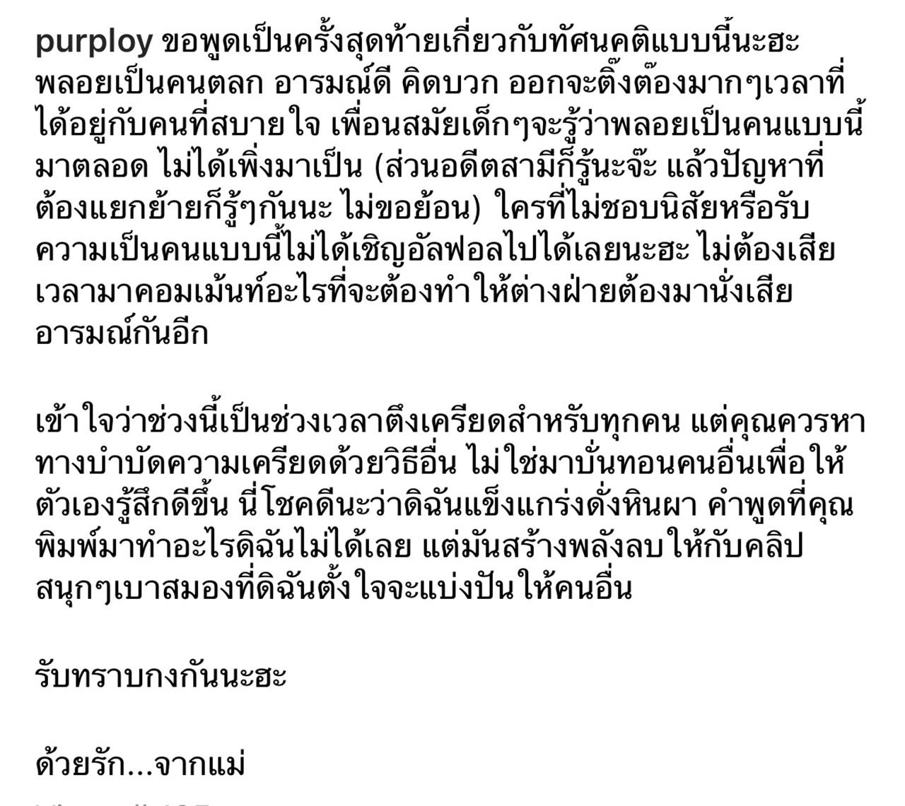 พร้อมกับแคปข้อความดังกล่าวและเขียนแคปชั่นบรรยายแบบยาวเหยียดว่า "ขอพูดเป็นครั้งสุดท้ายเกี่ยวกับทัศนคติแบบนี้นะฮะ พลอยเป็นคนตลก อารมณ์ดี คิดบวก ออกจะติ๊งต๊องมากๆเวลาที่ได้อยู่กับคนที่สบายใจ