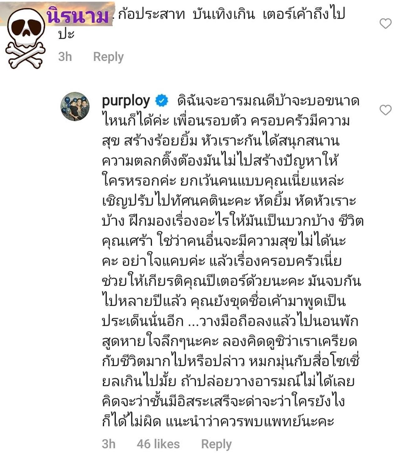 แต่เพราะความเป็นคนสนุกสนานเฮฮาของสาวพลอย จึงทำให้มีชาวเน็ตเข้ามาคอมเมนต์วิจารณ์คุณแม่ลูก 2 ในพื้นที่โซเชียลของเธอว่า