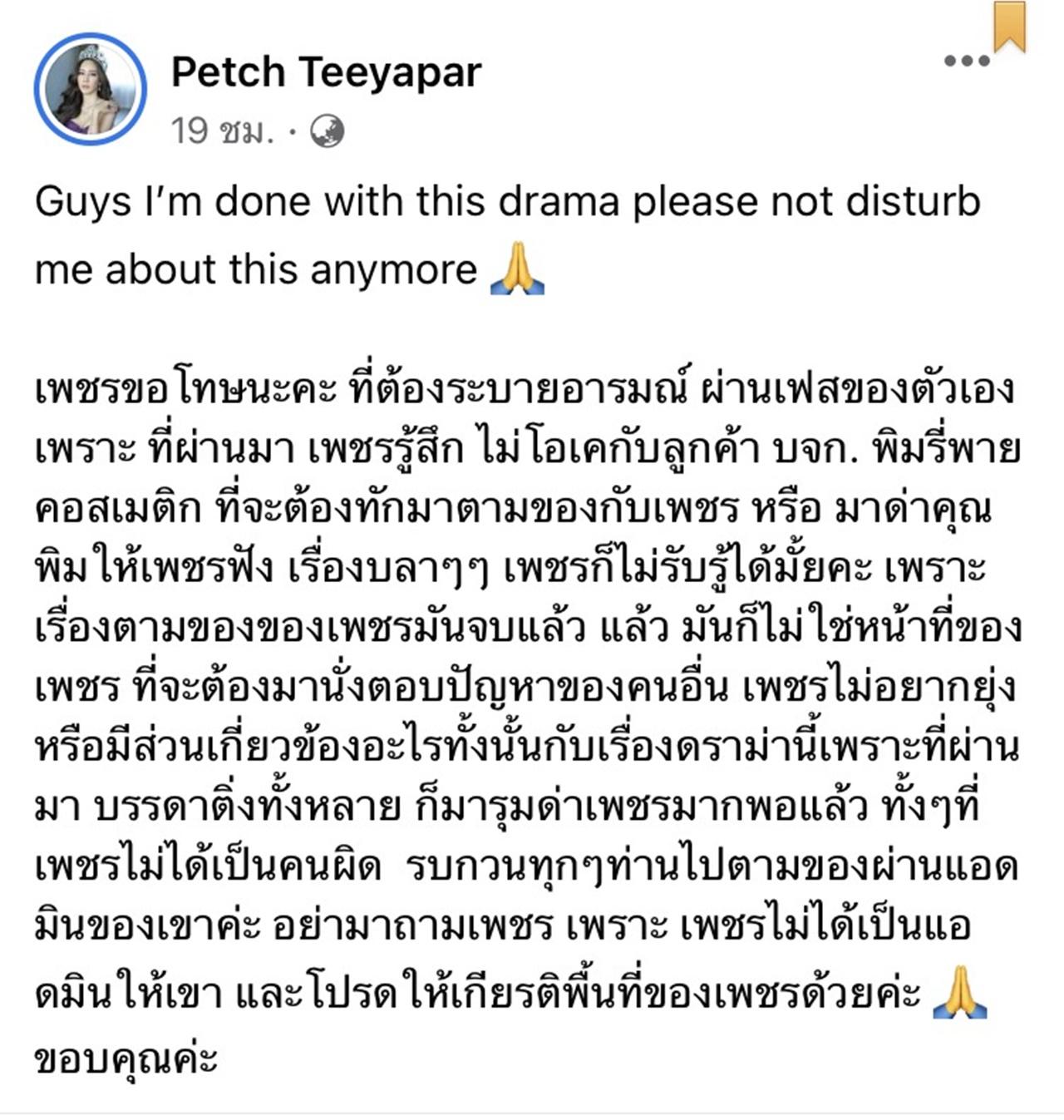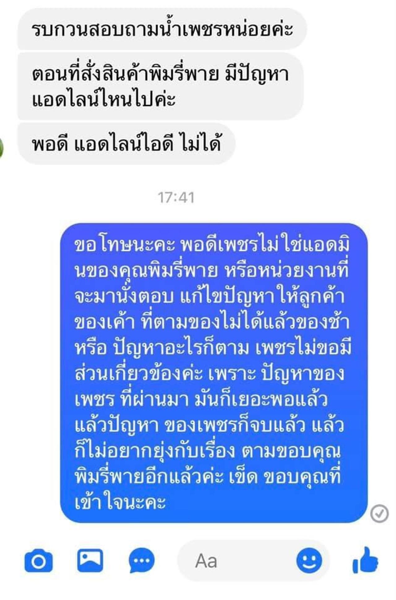เพชรขอโทษนะคะ ที่ต้องระบายอารมณ์ ผ่านเฟสของตัวเอง เพราะ ที่ผ่านมา เพชรรู้สึก ไม่โอเคกับลูกค้า บจก. พิมรี่พายคอสเมติก ที่จะต้องทักมาตามของกับเพชร หรือ มาด่าคุณพิมให้เพชรฟัง เรื่องบลาๆๆ เพชรก็ไม่รับรู้ได้มั้ยคะ