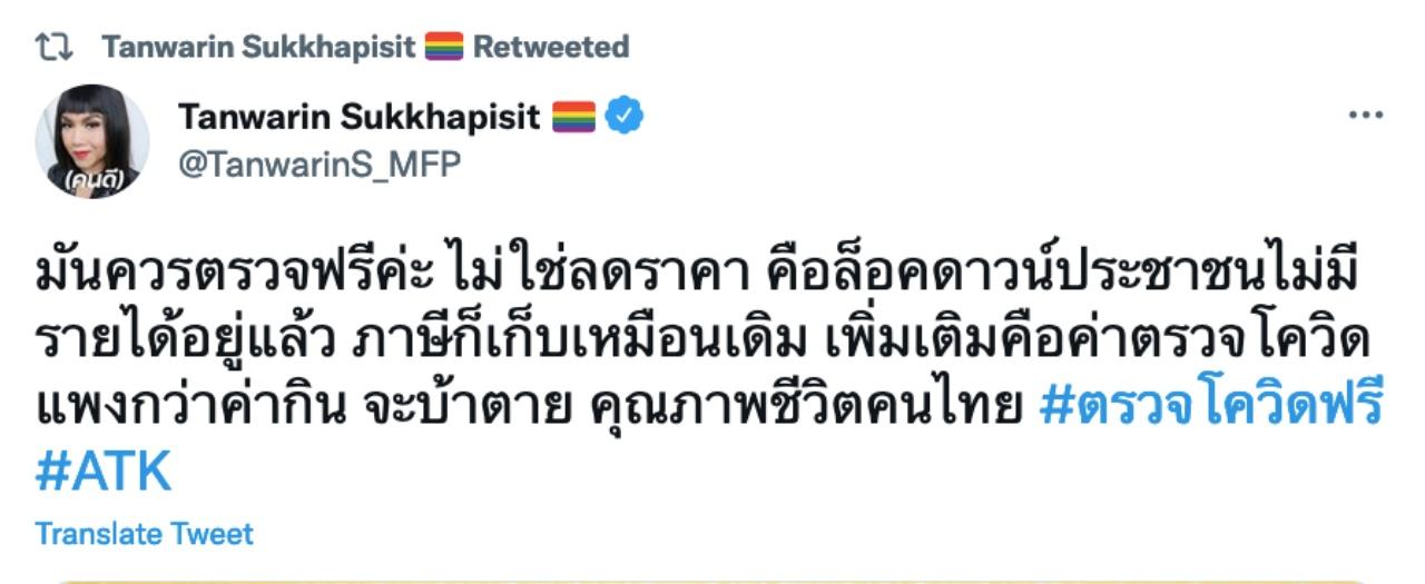 กอล์ฟ ธัญญ์วาริน ได้ทวีตที่ @TanwarinS_MFP ดังนี้ มันควรตรวจฟรีค่ะ ไม่ใช่ลดราคา คือล็อกดาวน์ประชาชนไม่มีรายได้อยู่แล้ว ภาษีก็เก็บเหมือนเดิม เพิ่มเติมคือค่าตรวจโควิดแพงกว่าค่ากิน จะบ้าตาย คุณภาพชีวิตคนไทย #ตรวจโควิดฟรี #ATK
