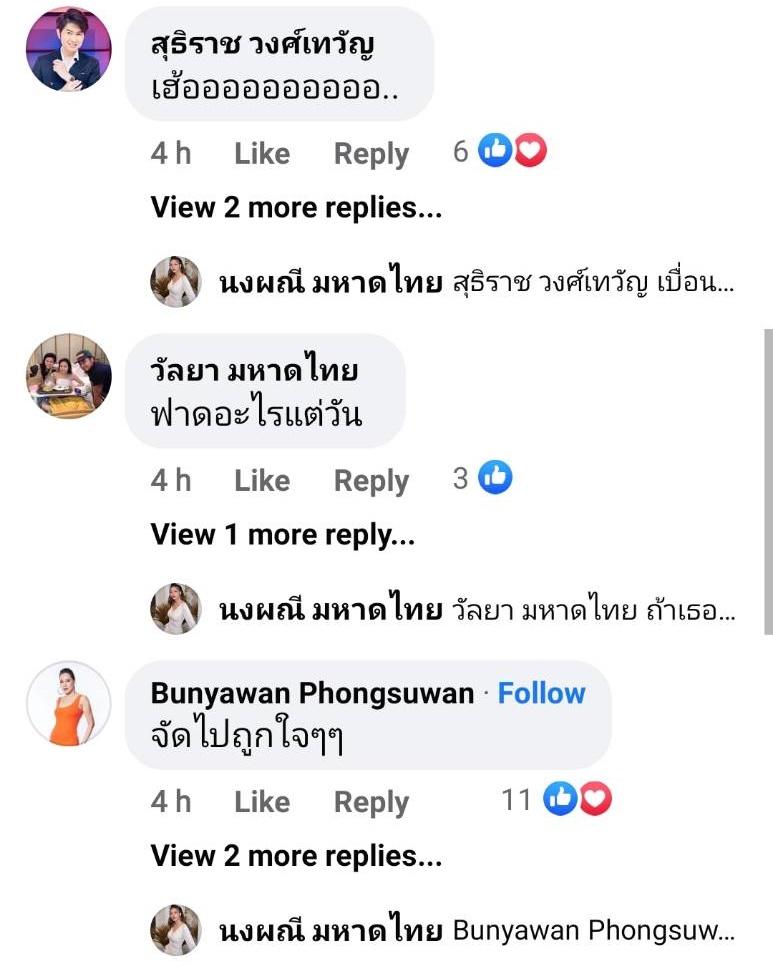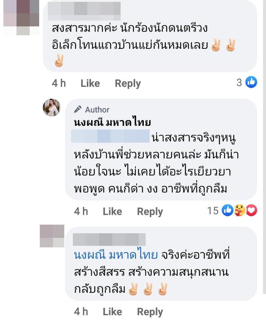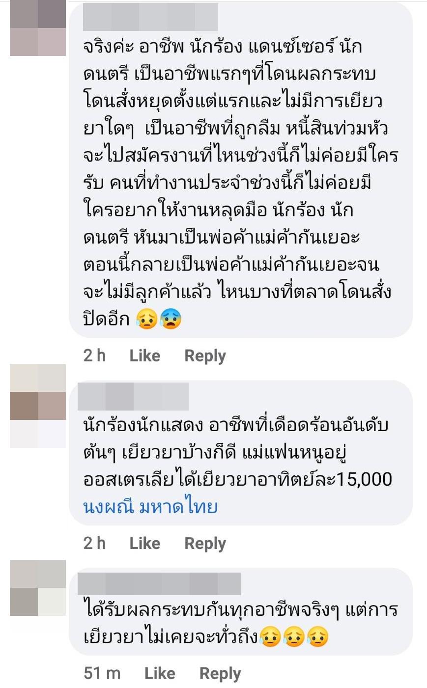 อีกทั้งยังมีคนแสดงความคิดเห็นว่า นักร้องนักดนตรีแถวบ้านก็แย่กันหมดเลย ซึ่งจ๊ะตอบกลับว่า “น่าสงสารจริงๆหนู หลังบ้านพี่ช่วยหลายคนล่ะ มันก็น่าน้อยใจนะ ไม่เคยได้อะไรเยียวยา พอพูด คนก็ด่า งง อาชีพที่ถูกลืม” ด้านคนในวงการบันเทิงก็เข้ามาคอมเมนต์ อาทิ ส้มเช้ง สามช่า “จัดไปถูกใจๆๆ”, กุ้ง สุธิราช “เฮ้ออออออออออ..” ฯลฯ