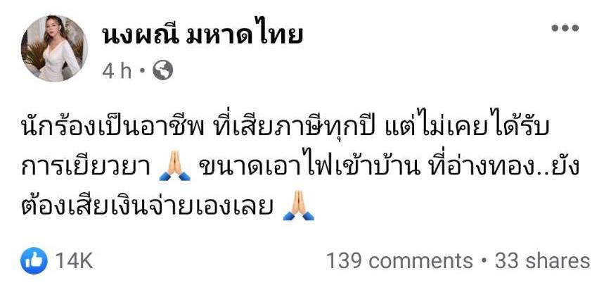 โดย จ๊ะ นงผณี โพสต์ข้อความลงในเฟซบุ๊กส่วนตัวไว้ว่า “นักร้องเป็นอาชีพที่เสียภาษีทุกปี แต่ไม่เคยได้รับการเยียวยา ขนาดเอาไฟเข้าบ้าน ที่อ่างทอง..ยังต้องเสียเงินจ่ายเองเลย” ท่ามกลางคอมเมนต์แสดงความคิดเห็นจากคนในวงการเพลงรวมถึงแฟนๆ เป็นจำนวนมาก