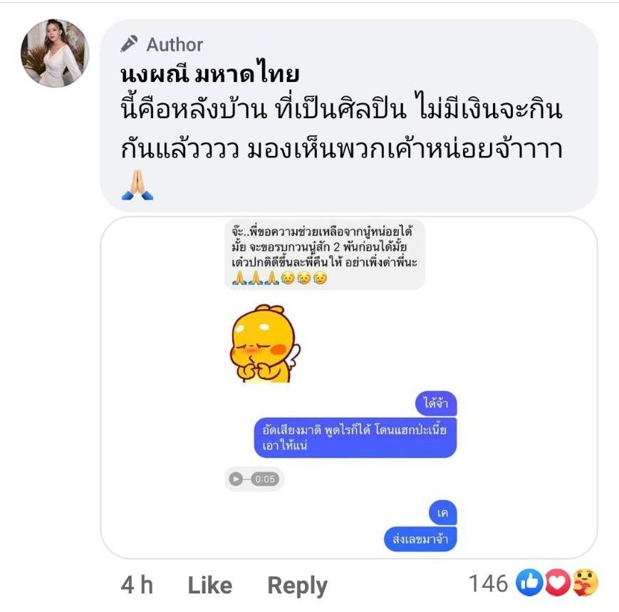 นอกจากนี้ จ๊ะ นงผณี ยังโพสต์คอมเมนต์ใต้ข้อความ โดยเป็นภาพข้อความแชตสนทนาที่มีคนมาขอยืมเงิน และเขียนข้อความว่า “นี้คือหลังบ้าน ที่เป็นศิลปิน ไม่มีเงินจะกินกันแล้วววว มองเห็นพวกเค้าหน่อยจ้าาาา” ซึ่งในแชตสนทนาเป็นศิลปินคนหนึ่งที่จ๊ะรู้จักส่งข้อความมาขอยืมเงิน 2,000 บาท ก่อนที่จ๊ะตอบกลับว่าให้อัดเสียงมาเพื่อยืนยันตัวตน เพราะกลัวว่าอีกฝ่ายจะถูกแฮกเฟซบุ๊ก และเมื่อได้ยินเสียงอีกฝ่ายแล้วจึงบอกให้ส่งเลขบัญชีมา