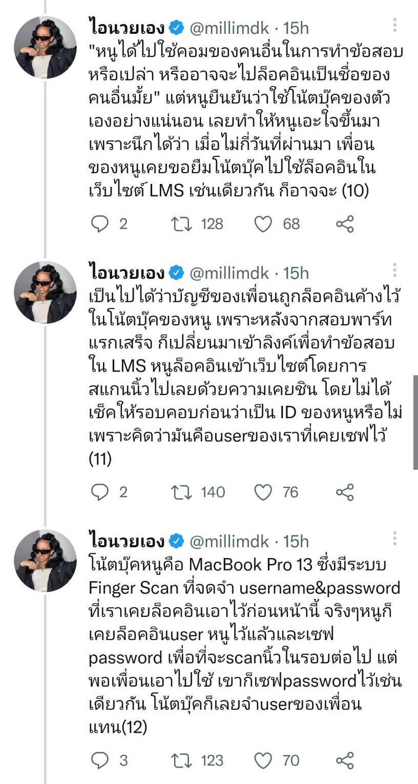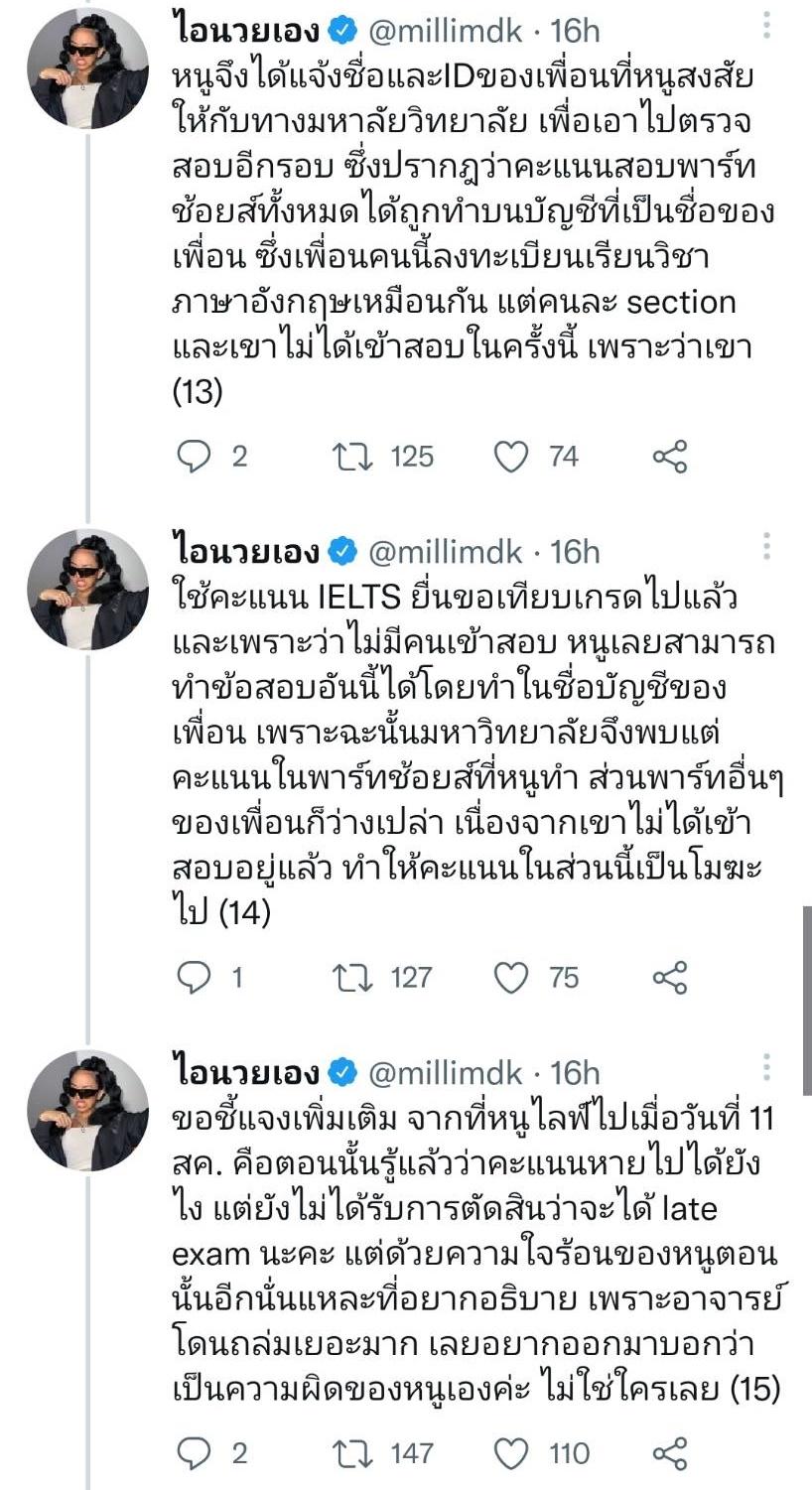 ขอชี้แจงเพิ่มเติม จากที่หนูไลฟ์ไปเมื่อวันที่ 11 ส.ค. คือตอนนั้นรู้แล้วว่าคะแนนหายไปได้ยังไง แต่ยังไม่ได้รับการตัดสินว่าจะได้ late exam นะคะ แต่ด้วยความใจร้อนของหนูตอนนั้นอีกนั่นแหละที่อยากอธิบาย เพราะอาจารย์โดนถล่มเยอะมาก เลยอยากออกมาบอกว่าเป็นความผิดของหนูเองค่ะ ไม่ใช่ใครเลย รวมถึงมีการพูดไปว่าได้ late exam แล้ว ซึ่งหนูพูดไม่เคลียร์เองค่ะ และตอนนั้นก็ถูกคนอื่นเข้าใจไปแล้วว่าได้สอบใหม่ ตรงนี้หนูผิดเองจริงๆ ค่ะ ต้องขอโทษด้วยนะคะ