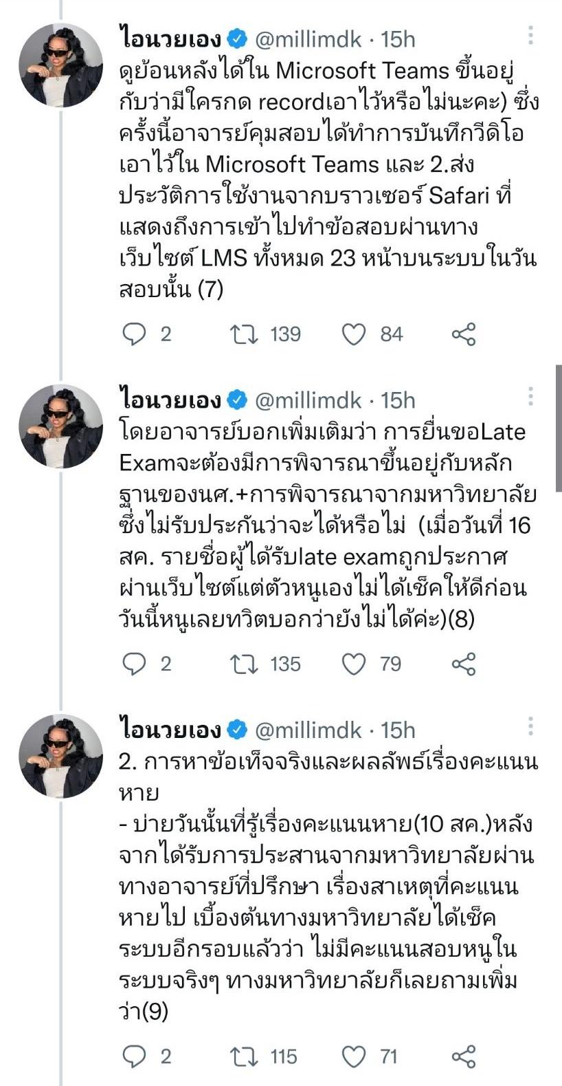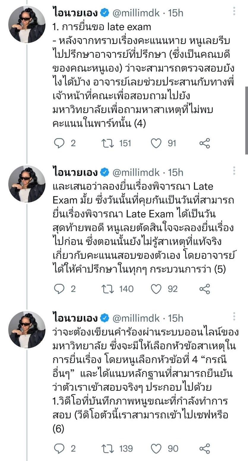 โดยอาจารย์บอกเพิ่มเติมว่า การยื่นขอ Late Exam จะต้องมีการพิจารณาขึ้นอยู่กับหลักฐานของนศ.+การพิจารณาจากมหาวิทยาลัย ซึ่งไม่รับประกันว่าจะได้หรือไม่ (เมื่อวันที่ 16 ส.ค. รายชื่อผู้ได้รับ late exam ถูกประกาศผ่านเว็บไซต์ แต่ตัวหนูเองไม่ได้เช็กให้ดีก่อนวันนี้ หนูเลยทวิตบอกว่ายังไม่ได้ค่ะ)