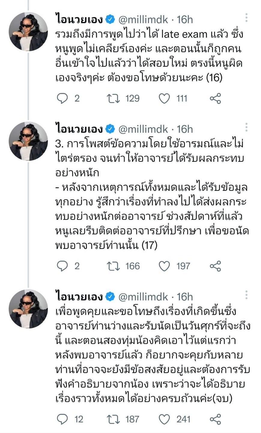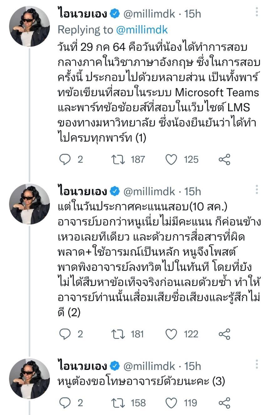 แต่ในวันประกาศคะแนนสอบ (10 ส.ค.) อาจารย์บอกว่าหนูเนี่ยไม่มีคะแนน ก็ค่อนข้างเหวอเลยทีเดียว และด้วยการสื่อสารที่ผิดพลาด+ใช้อารมณ์เป็นหลัก หนูจึงโพสต์พาดพิงอาจารย์ลงทวิตไปในทันที โดยที่ยังไม่ได้สืบหาข้อเท็จจริงก่อนเลยด้วยซ้ำ ทำให้อาจารย์ท่านนั้นเสื่อมเสียชื่อเสียงและรู้สึกไม่ดี หนูต้องขอโทษอาจารย์ด้วยนะคะ