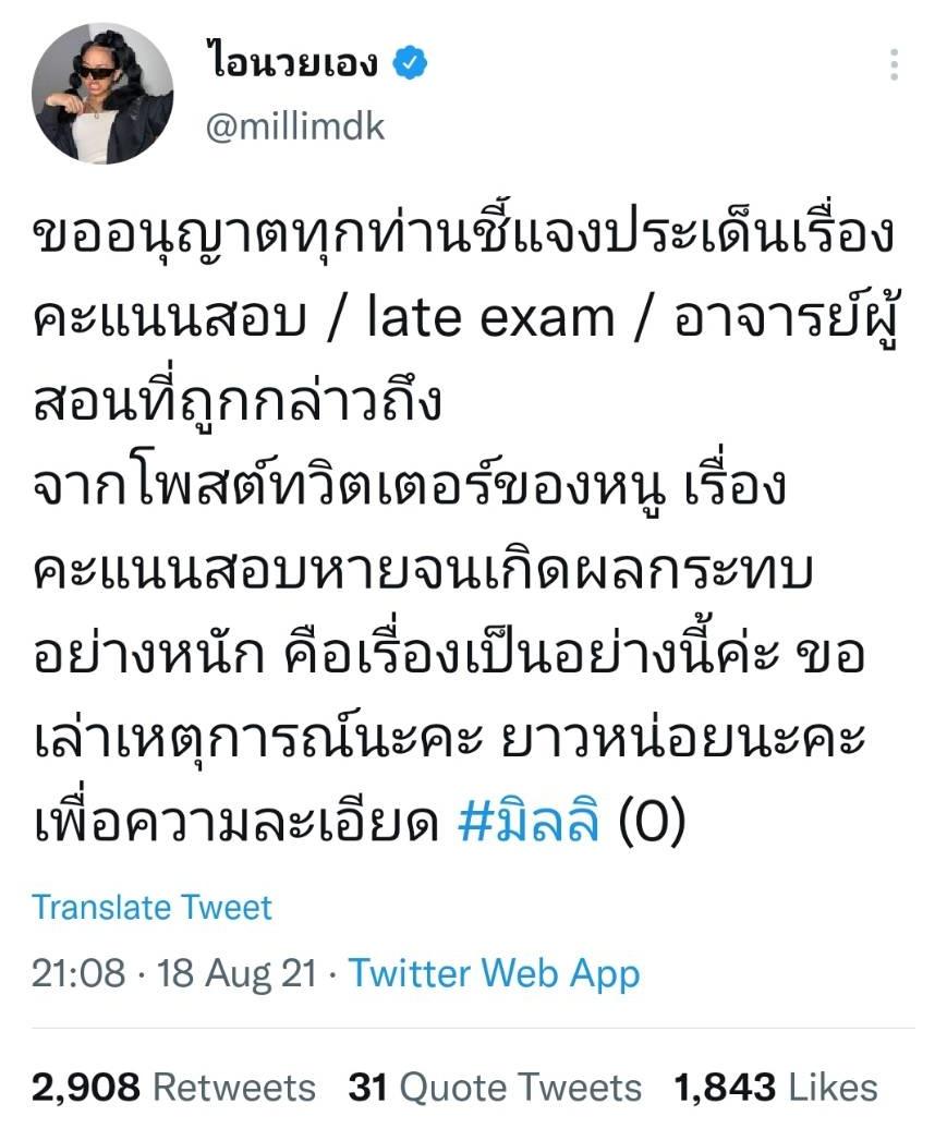 ล่าสุด มิลลิ ดนุภา ได้ชี้แจงถึงเรื่องนี้ผ่านทางทวิตเตอร์แล้ว โดยบอกว่า “ขออนุญาตทุกท่านชี้แจงประเด็นเรื่องคะแนนสอบ / late exam / อาจารย์ผู้สอนที่ถูกกล่าวถึง จากโพสต์ทวิตเตอร์ของหนู เรื่องคะแนนสอบหายจนเกิดผลกระทบอย่างหนัก คือเรื่องเป็นอย่างนี้ค่ะ ขอเล่าเหตุการณ์นะคะ ยาวหน่อยนะคะ เพื่อความละเอียด