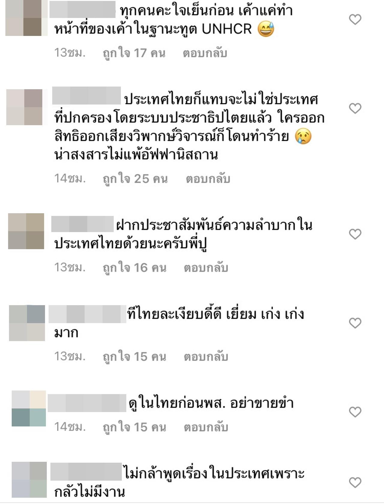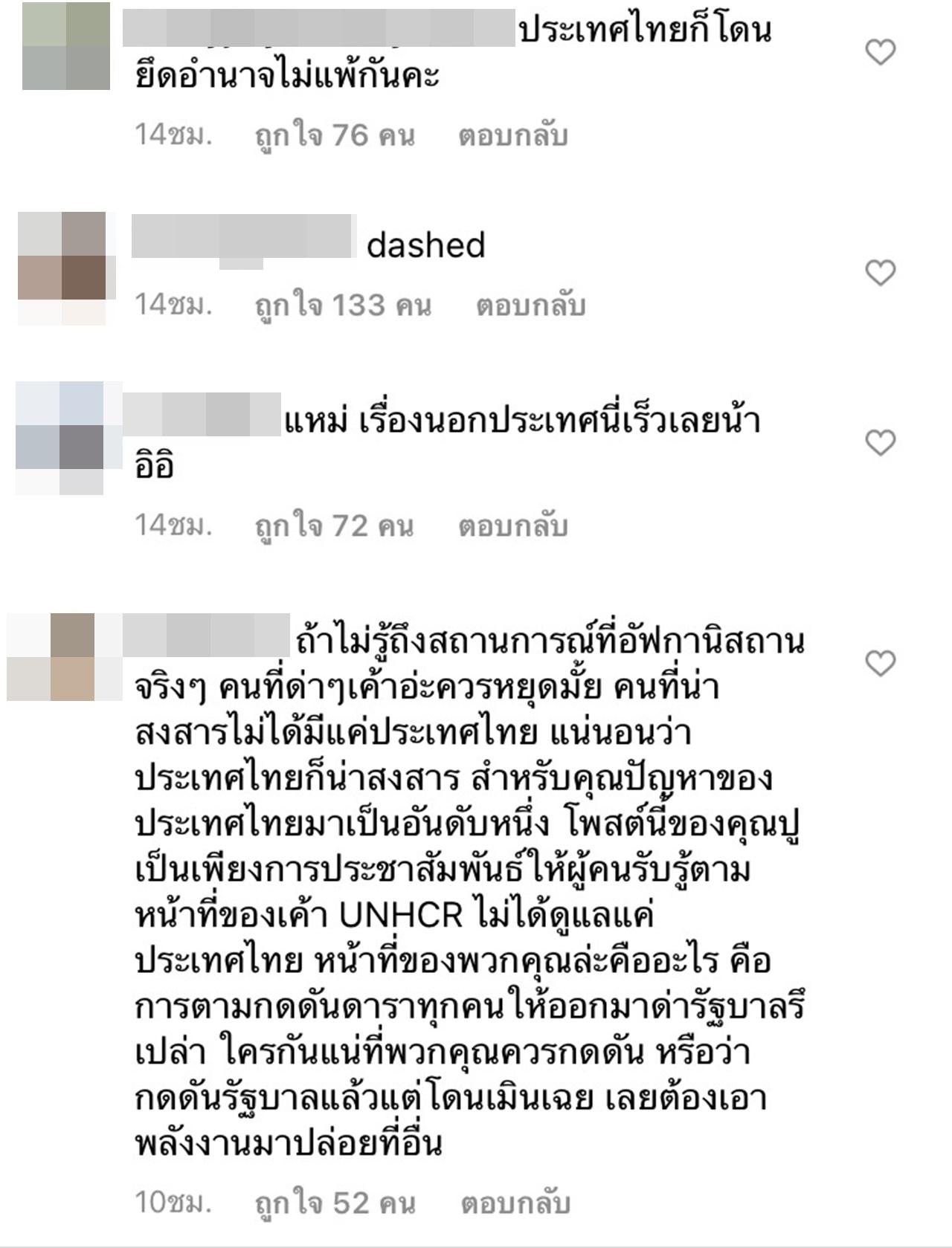 "ถ้าไม่รู้ถึงสถานการณ์ที่อัฟกานิสถานจริงๆ คนที่ด่าๆเค้าอ่ะควรหยุดมั้ย คนที่น่าสงสารไม่ได้มีแค่ประเทศไทย แน่นอนว่าประเทศไทยก็น่าสงสาร สำหรับคุณปัญหาของประเทศไทยมาเป็นอันดับหนึ่ง โพสต์นี้ของคุณปูเป็นเพียงการประชาสัมพันธ์ให้ผู้คนรับรู้ตามหน้าที่ของเค้า UNHCR ไม่ได้ดูแลแค่ประเทศไทย หน้าที่ของพวกคุณล่ะคืออะไร คือการตามกดดันดาราทุกคนให้ออกมาด่ารัฐบาลรึเปล่า ใครกันแน่ที่พวกคุณควรกดดัน หรือว่ากดดันรัฐบาลแล้วแต่โดนเมินเฉย เลยต้องเอาพลังงานมาปล่อยที่อื่น" เป็นต้น.