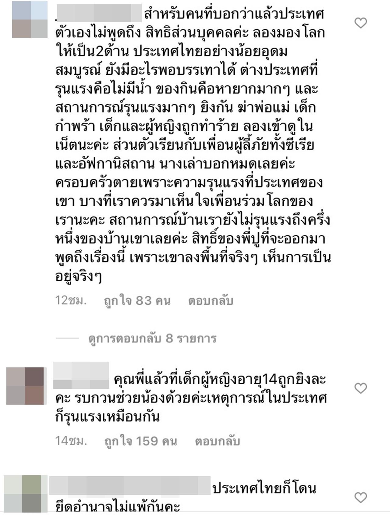 "สำหรับคนที่บอกว่าแล้วประเทศตัวเองไม่พูดถึง สิทธิส่วนบุคคลค่ะ ลองมองโลกให้เป็น2ด้าน ประเทศไทยอย่างน้อยอุดมสมบูรณ์ ยังมีอะไรพอบรรเทาได้ ต่างประเทศที่รุนแรงคือไม่มีน้ำ ของกินคือหายากมากๆ และสถานการณ์รุนแรงมากๆ ยิงกัน ฆ่าพ่อแม่ เด็กกำพร้า เด็กและผู้หญิงถูกทำร้าย ลองเข้าดูในเน็ตนะคะ ส่วนตัวเรียนกับเพื่อนผู้ลี้ภัยทั้งซีเรียและอัฟกานิสถาน นางเล่าบอกหมดเลยค่ะ ครอบครัวตายเพราะความรุนแรงที่ประเทศของเขา บางทีเราควรมาเห็นใจเพื่อนร่วมโลกของเรานะคะ สถานการณ์บ้านเรายังไม่รุนแรงถึงครึ่งหนึ่งของบ้านเขาเลยค่ะ สิทธิ์ของพี่ปูที่จะออกมาพูดถึงเรื่องนี้ เพราะเขาลงพื้นที่จริงๆ เห็นการเป็นอยู่จริงๆ"