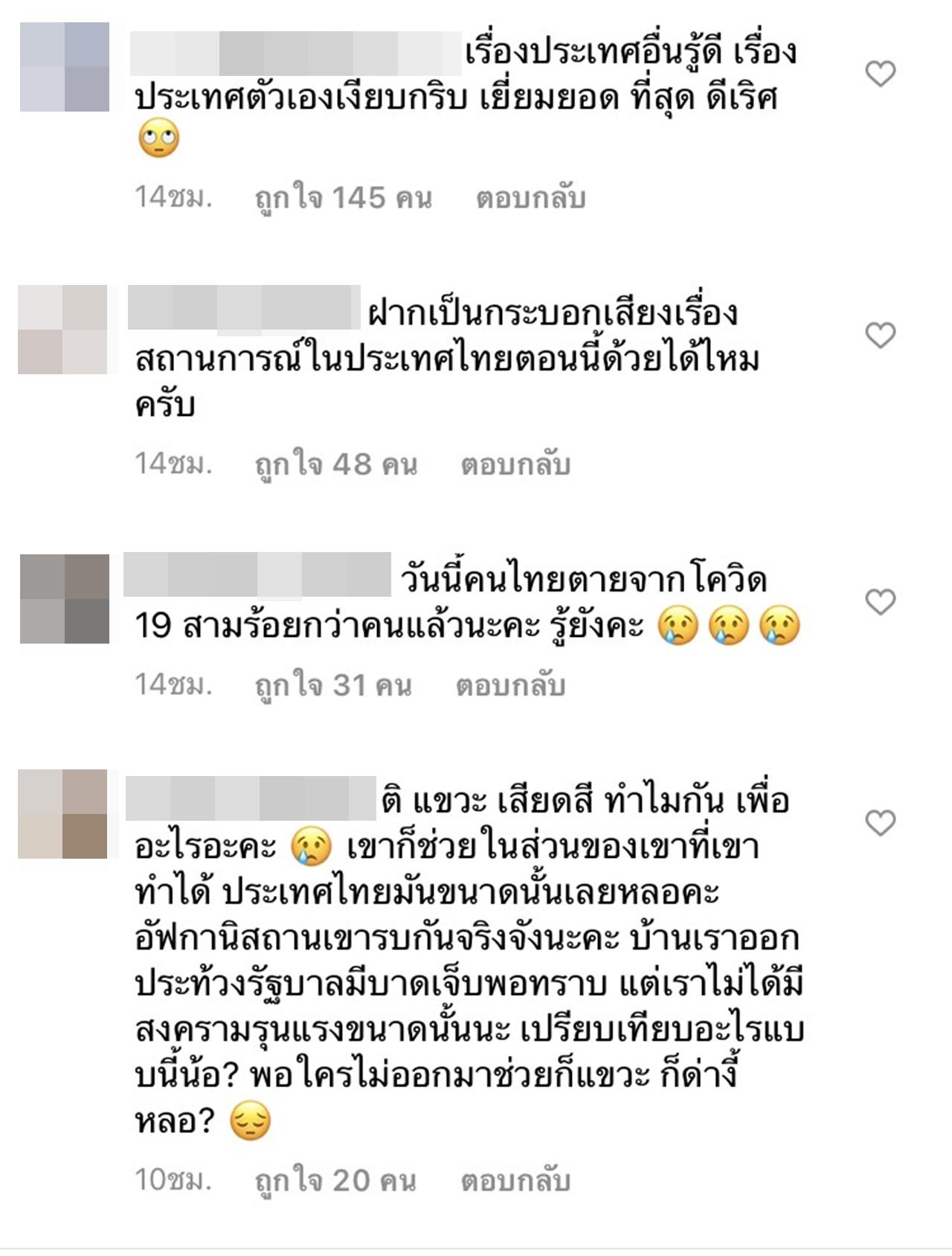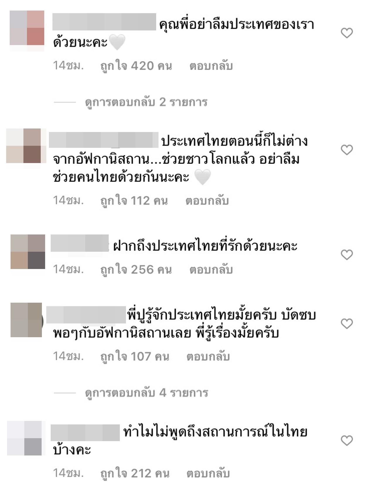 "คุณพี่อย่าลืมประเทศของเราด้วยนะคะ", "ฝากถึงประเทศไทยที่รักด้วยนะคะ", "ประเทศไทยตอนนี้ก็ไม่ต่างจากอัฟกานิสถาน...ช่วยชาวโลกแล้ว อย่าลืมช่วยคนไทยด้วยกันนะคะ", "ทำไมไม่พูดถึงสถานการณ์ในไทยบ้างคะ", "เรื่องประเทศอื่นรู้ดี เรื่องประเทศตัวเองเงียบกริบ เยี่ยมยอด ที่สุด ดีเริศ"