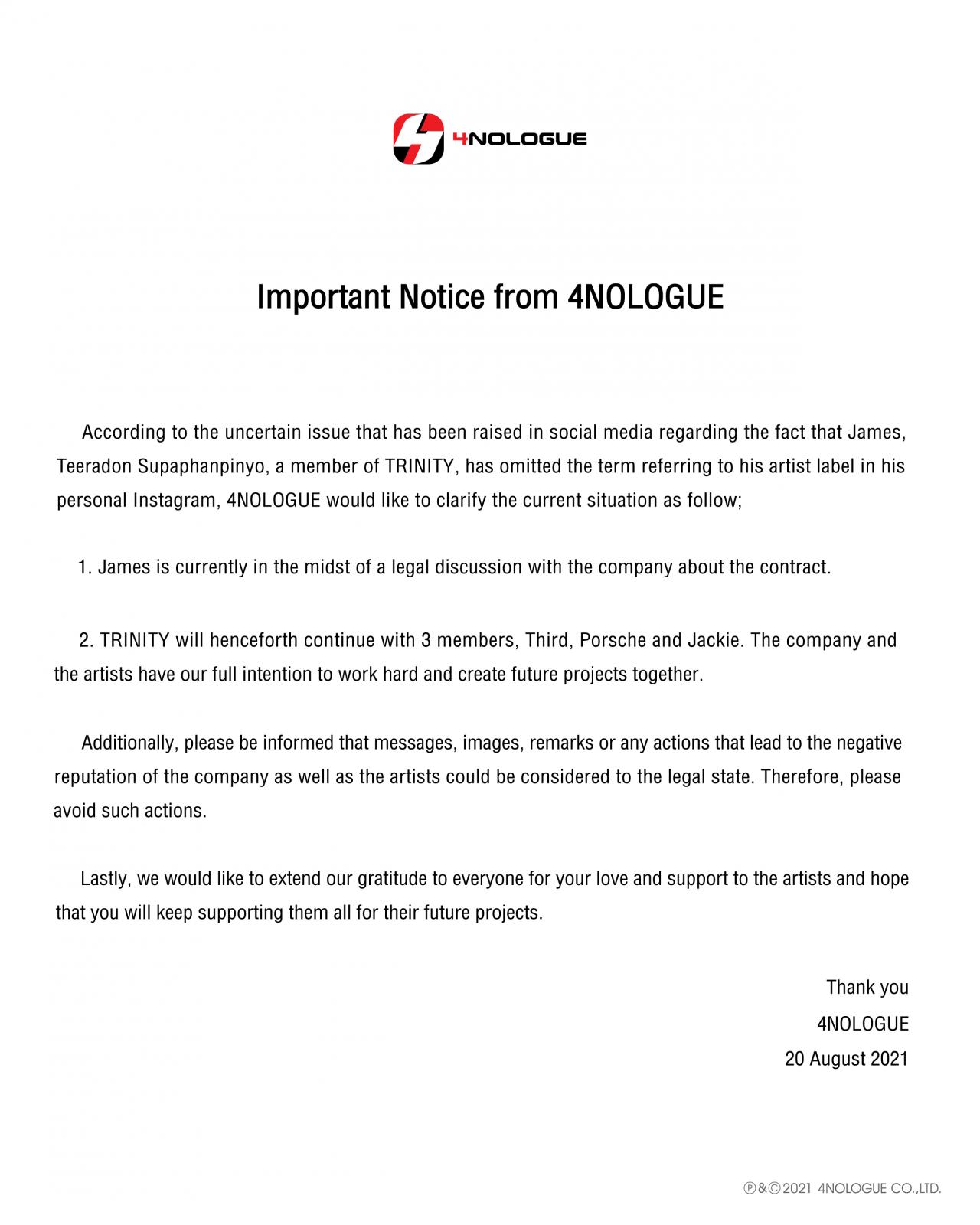 “เนื่องจากสัปดาห์ที่ผ่านมา มีประเด็นข้อสงสัยบนสังคมออนไลน์ และในสื่อต่างๆ เกี่ยวกับ “เจมส์ ธีรดนย์ ศุภพันธุ์ภิญโญ” หนึ่งในสมาชิกวง TRINITY ซึ่งได้ลบข้อความอันแสดงถึงต้นสังกัดออกจากอินสตาแกรมส่วนตัว ทางบริษัท โฟร์โนล็อค จำกัด จึงมีความจำเป็นที่จะต้องขอชี้แจง ดังนี้