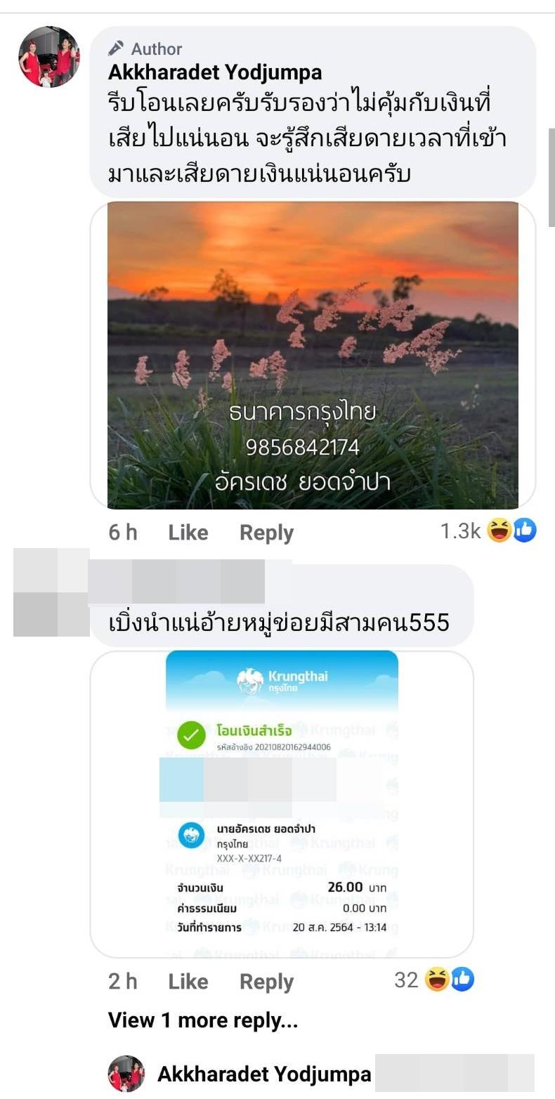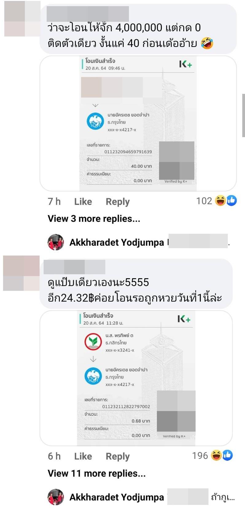ท่ามกลางคอมเมนต์สุดฮาจากแฟนๆ ที่โพสต์สลิปการโอนเงินและข้อความ อาทิ เบิ่งนำแน่อ้ายหมู่ข่อยมีสามคน 555, ว่าจะโอนให้จั๊ก 4,000,000 แต่กด 0 ติดตัวเดียว งั้นแค่ 40 ก่อนเด้ออ้าย, ดูแป๊บเดียวเองนะ 5555 อีก 24.32฿ ค่อยโอนรอถูกหวยวันที่ 1 นี้ล่ะ, เป็นการตลาดที่จริงใจมากค่ะ 55555 ฯลฯ