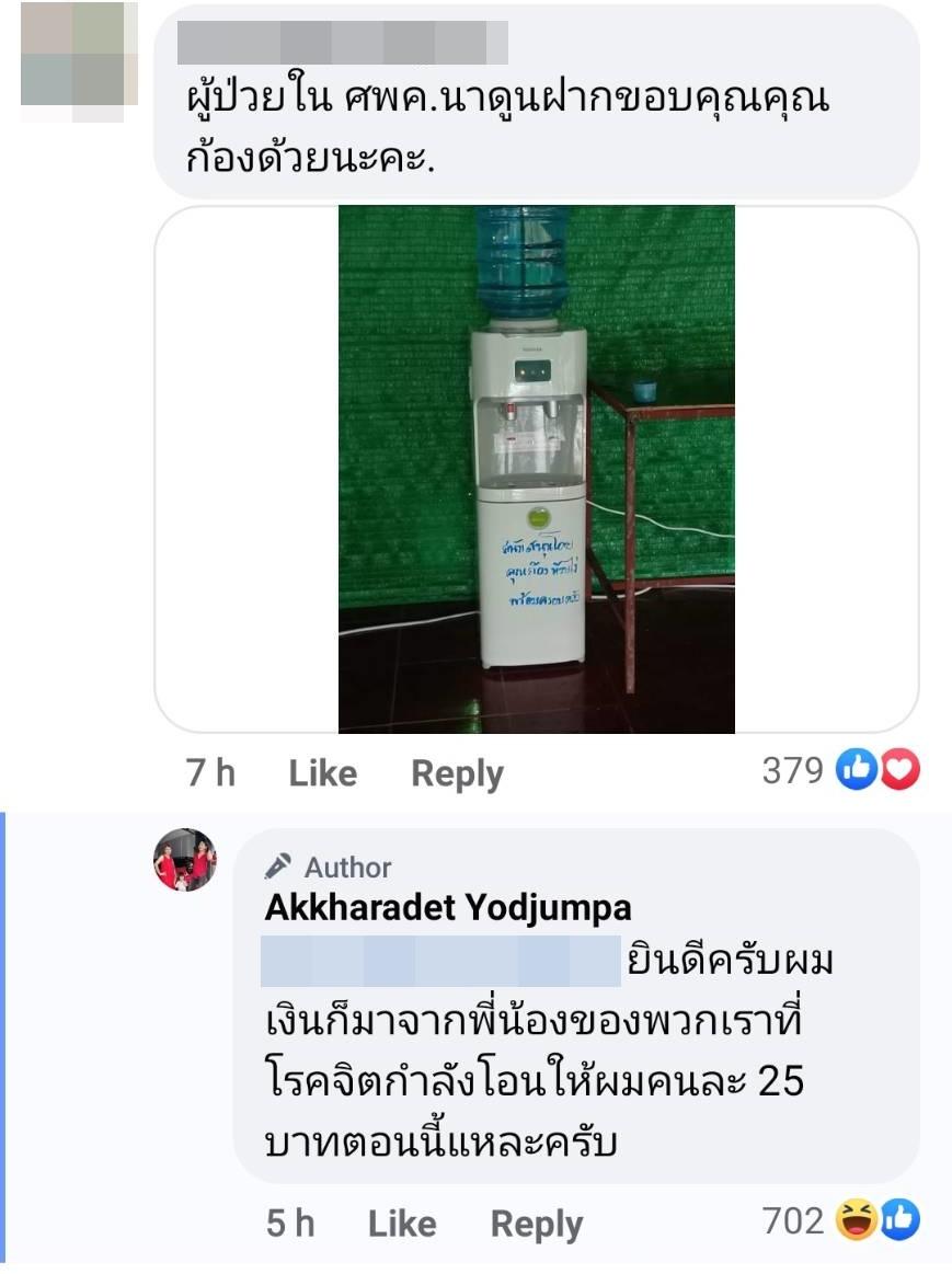 นอกจากนี้ยังมีแฟนๆ ที่เข้ามาคอมเมนต์ขอบคุณก้อง ห้วยไร่ สำหรับตู้กดน้ำ โดยโพสต์ภาพตู้กดน้ำแล้วบอกว่า “ผู้ป่วยใน ศพค.นาดูนฝากขอบคุณคุณก้องด้วยนะคะ.” และก้องตอบกลับว่า “ยินดีครับผม เงินก็มาจากพี่น้องของพวกเราที่โรคจิตกำลังโอนให้ผมคนละ 25 บาทตอนนี้แหละครับ”.