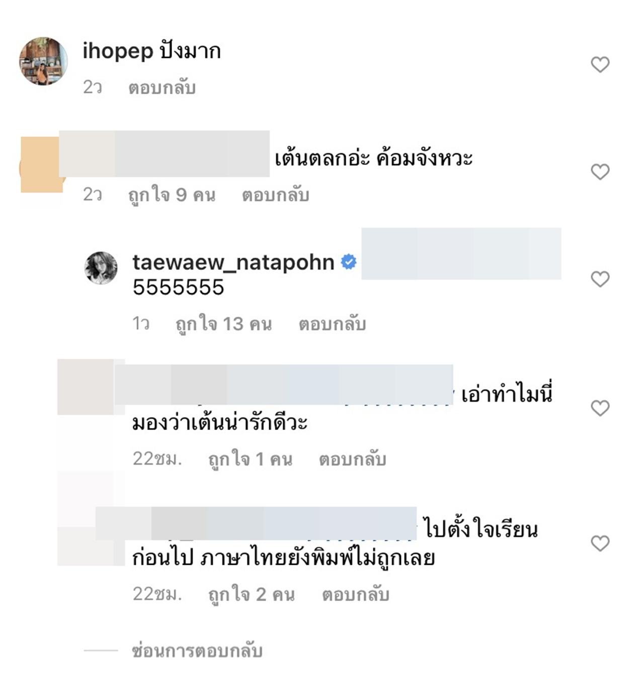 งานนี้นางเอกสาวถึงกับมาคอมเมนต์กลับว่า "555555" ก่อนที่จะมีชาวเน็ตเข้ามาคอมเมนต์ว่า "เอ้า ทำไมนี่มองว่าเต้นน่ารักดี" และ "ไปตั้งใจเรียนก่อนไป ภาษาไทยยังพิมพ์ไม่ถูกเลย".