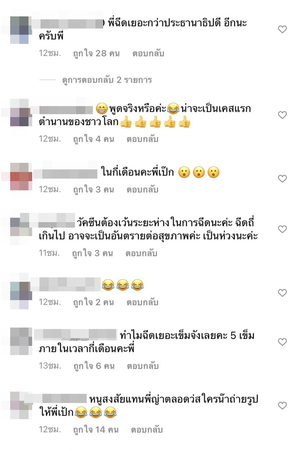 และก็มีบางคนเข้ามาคอมเมนต์แซวขำๆ ต่อว่า "พูดจริงหรือค่ะ น่าจะเป็นเคสแรกตำนานของชาวโลก, พี่ฉีดเยอะกว่าประธานาธิปดี อีกนะครับพี่"