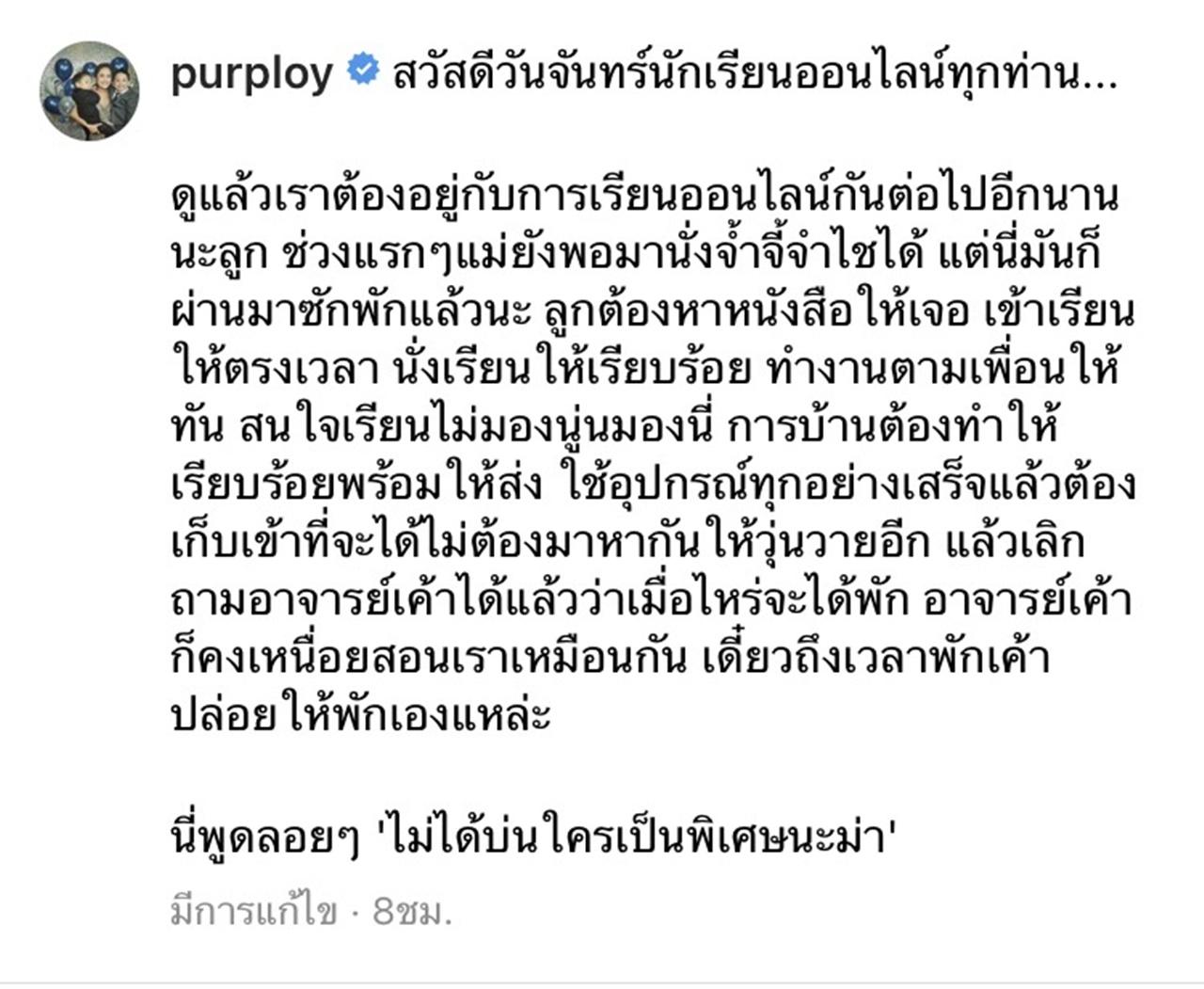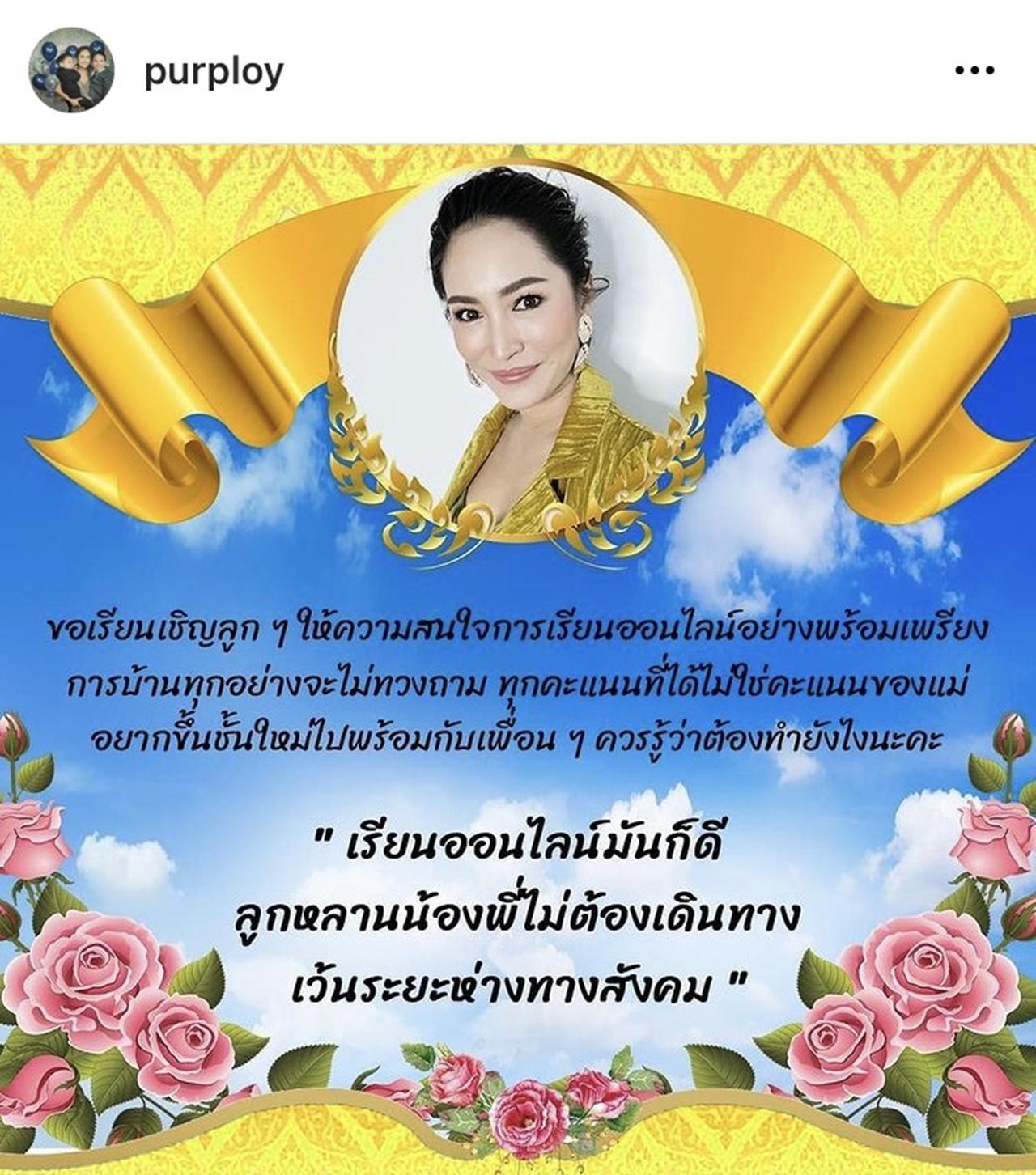 พร้อมเขียนแคปชั่นว่า "สวัสดีวันจันทร์นักเรียนออนไลน์ทุกท่าน... ดูแล้วเราต้องอยู่กับการเรียนออนไลน์กันต่อไปอีกนานนะลูก ช่วงแรกๆ แม่ยังพอมานั่งจ้ำจี้จ้ำไชได้ แต่นี่มันก็ผ่านมาซักพักแล้วนะ ลูกต้องหาหนังสือให้เจอ เข้าเรียนให้ตรงเวลา นั่งเรียนให้เรียบร้อย ทำงานตามเพื่อนให้ทัน