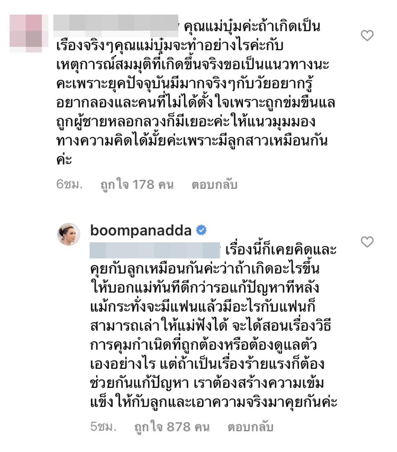 และ บุ๋ม ได้ตอบกลับว่า "เรื่องนี้ก็เคยคิดและคุยกับลูกเหมือนกันค่ะว่าถ้าเกิดอะไรขึ้นให้บอกแม่ทันทีดีกว่ารอแก้ปัญหาทีหลัง แม้กระทั่งจะมีแฟนแล้วมีอะไรกับแฟนก็สามารถเล่าให้แม่ฟังได้ จะได้สอนเรื่องวิธีการคุมกำเนิดที่ถูกต้องหรือต้องดูแลตัวเองอย่างไร แต่ถ้าเป็นเรื่องร้ายแรงก็ต้องช่วยกันแก้ปัญหา เราต้องสร้างความเข้มแข็งให้กับลูกและเอาความจริงมาคุยกันค่ะ".