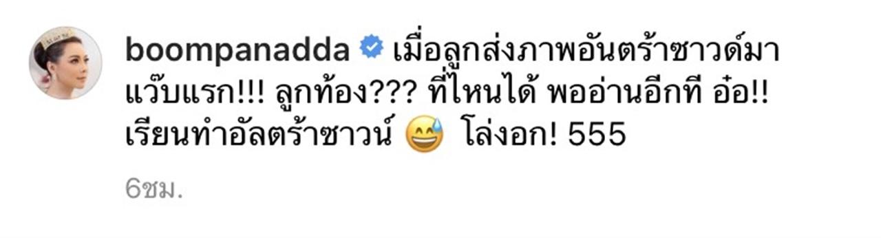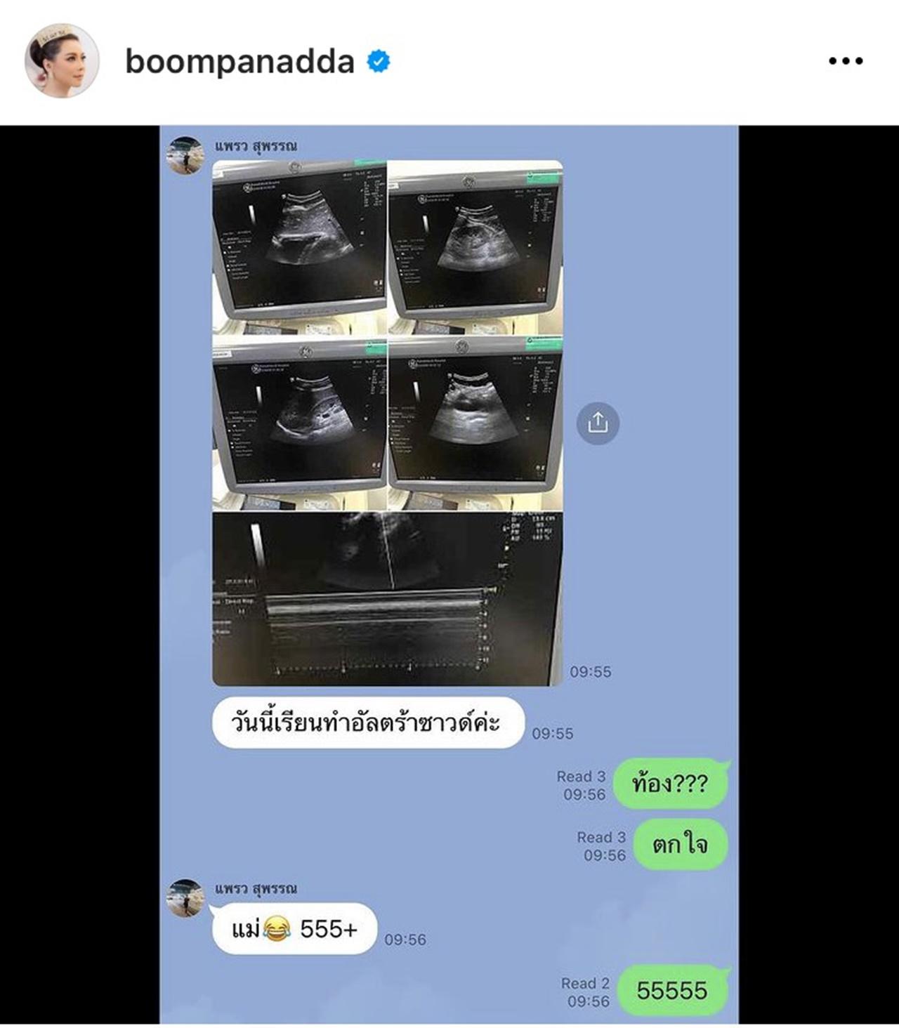 ทั้งนี้ บุ๋ม ก็ได้เขียนแคปชั่นเล่าให้ฟังว่า "เมื่อลูกส่งภาพอันตร้าซาวด์มา แว๊บแรก!!! ลูกท้อง??? ที่ไหนได้ พออ่านอีกที อ๋อ!! เรียนทำอัลตร้าซาวน์ โล่งอก! 555"