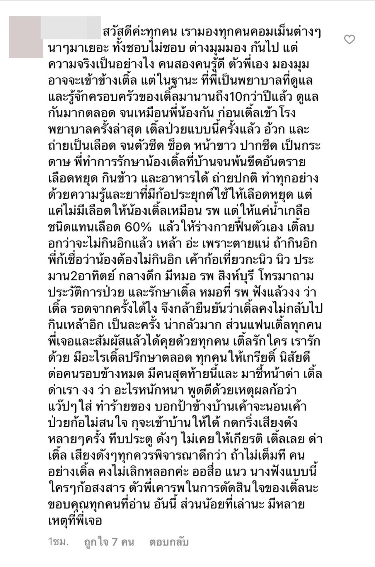 ตัวพี่เองมองมุมอาจจะเข้าข้างเติ้ล แต่ในฐานะที่พี่เป็นพยาบาลที่ดูแลและรู้จักครอบครัวของเติ้ลมานานถึง 10 กว่าปีแล้ว ดูแลกันมากตลอดจนเหมือนพี่น้องกัน