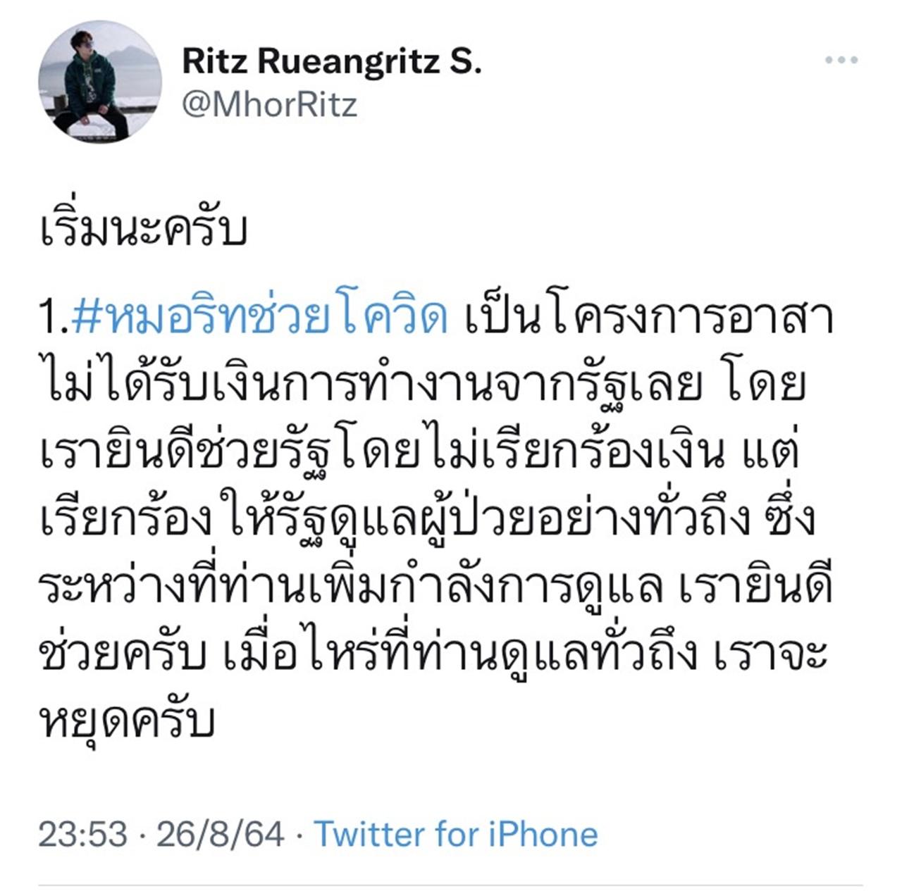 1.#หมอริทช่วยโควิด เป็นโครงการอาสา ไม่ได้รับเงินการทำงานจากรัฐเลย โดยเรายินดีช่วยรัฐโดยไม่เรียกร้องเงิน แต่เรียกร้องให้รัฐดูแลผู้ป่วยอย่างทั่วถึง ซึ่งระหว่างที่ท่านเพิ่มกำลังการดูแล เรายินดีช่วยครับ เมื่อไหร่ที่ท่านดูแลทั่วถึง เราจะหยุดครับ