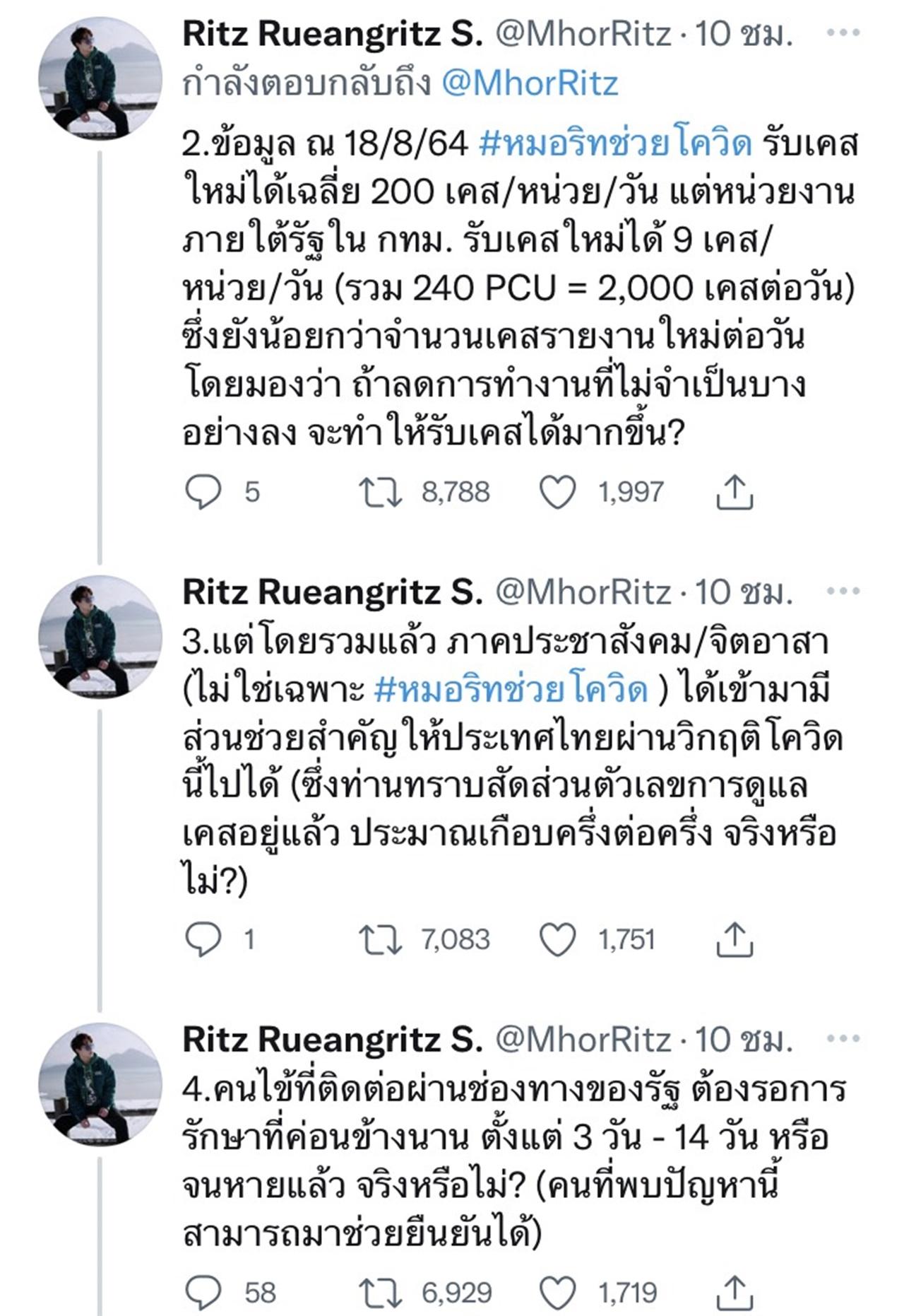2.ข้อมูล ณ 18/8/64 #หมอริทช่วยโควิด รับเคสใหม่ได้เฉลี่ย 200 เคส/หน่วย/วัน แต่หน่วยงานภายใต้รัฐใน กทม. รับเคสใหม่ได้ 9 เคส/หน่วย/วัน (รวม 240 PCU = 2,000 เคสต่อวัน) ซึ่งยังน้อยกว่าจำนวนเคสรายงานใหม่ต่อวัน โดยมองว่า ถ้าลดการทำงานที่ไม่จำเป็นบางอย่างลง จะทำให้รับเคสได้มากขึ้น?