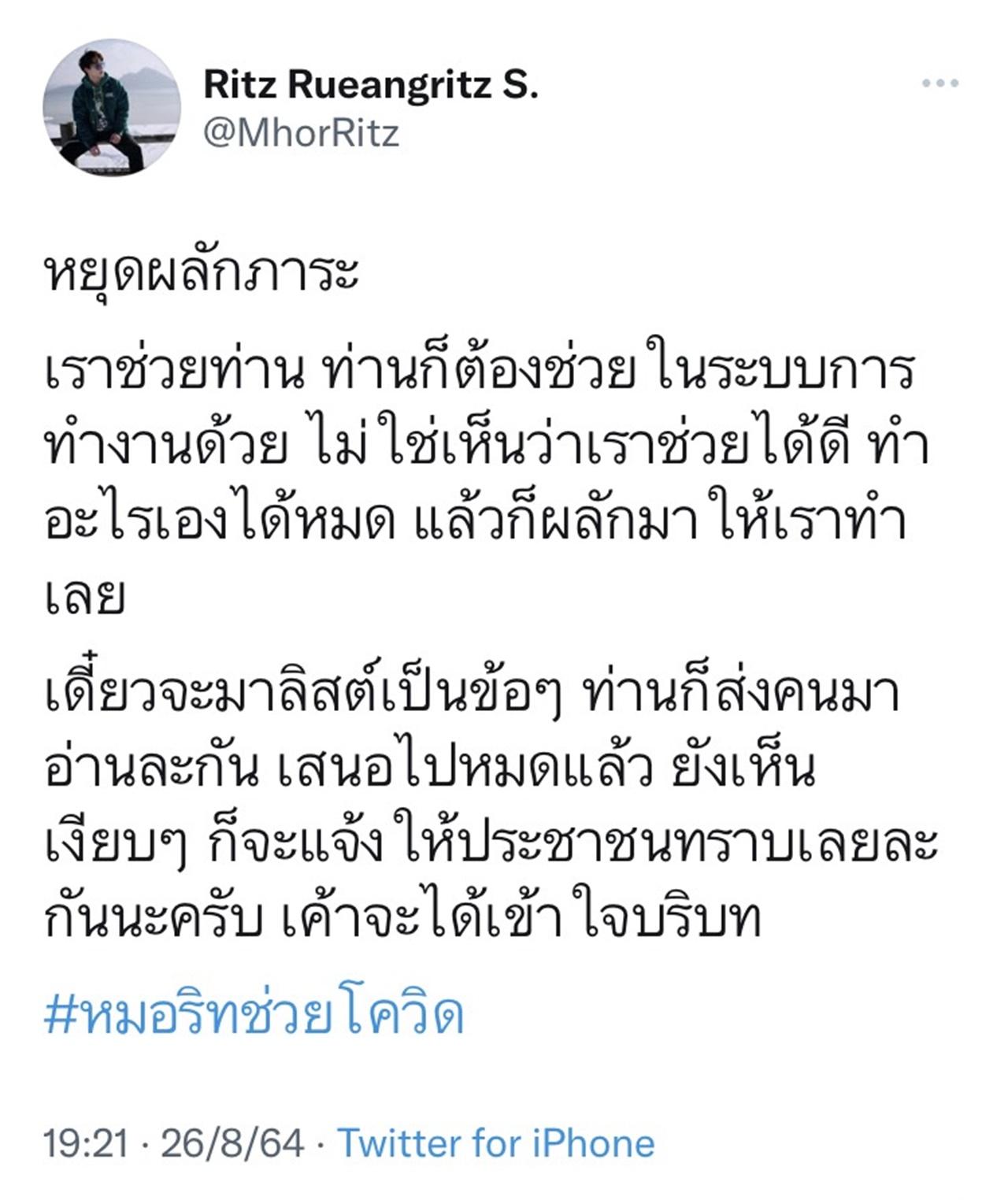 เดี๋ยวจะมาลิสต์เป็นข้อๆ ท่านก็ส่งคนมาอ่านละกัน เสนอไปหมดแล้ว ยังเห็นเงียบๆ ก็จะแจ้งให้ประชาชนทราบเลยละกันนะครับ เค้าจะได้เข้าใจบริบท #หมอริทช่วยโควิด"