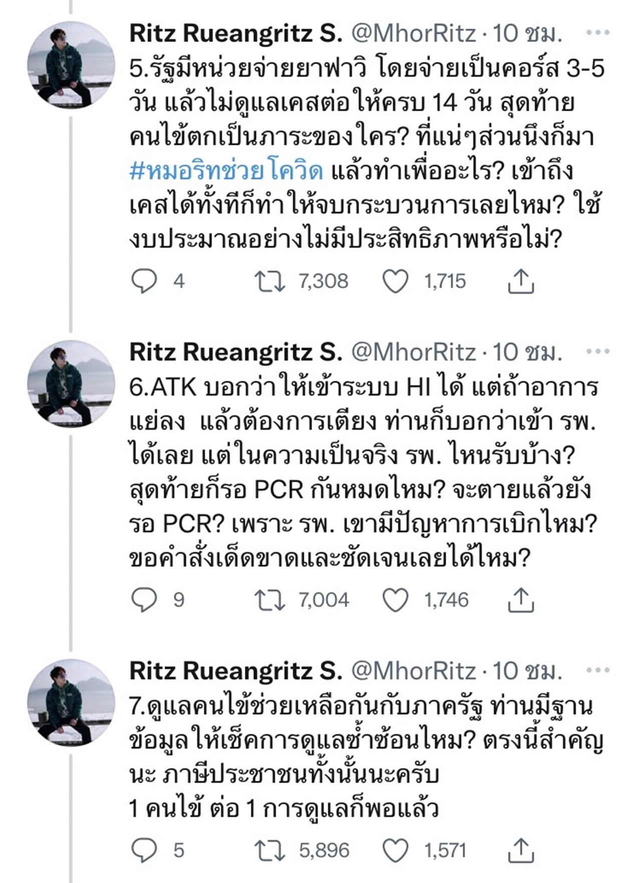5.รัฐมีหน่วยจ่ายยาฟาวิ โดยจ่ายเป็นคอร์ส 3-5 วัน แล้วไม่ดูแลเคสต่อให้ครบ 14 วัน สุดท้ายคนไข้ตกเป็นภาระของใคร? ที่แน่ๆส่วนนึงก็มา #หมอริทช่วยโควิด แล้วทำเพื่ออะไร? เข้าถึงเคสได้ทั้งทีก็ทำให้จบกระบวนการเลยไหม? ใช้งบประมาณอย่างไม่มีประสิทธิภาพหรือไม่?