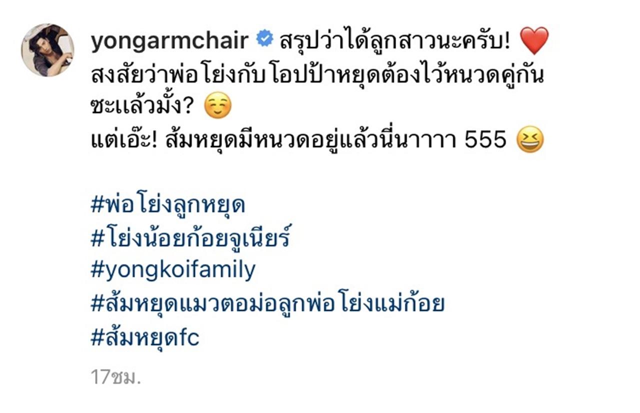 "สรุปว่าได้ลูกสาวนะครับ! สงสัยว่าพ่อโย่งกับโอปป้าหยุดต้องไว้หนวดคู่กันซะเเล้วมั้ง? แต่เอ๊ะ! ส้มหยุดมีหนวดอยู่แล้วนี่นาาาา 555"