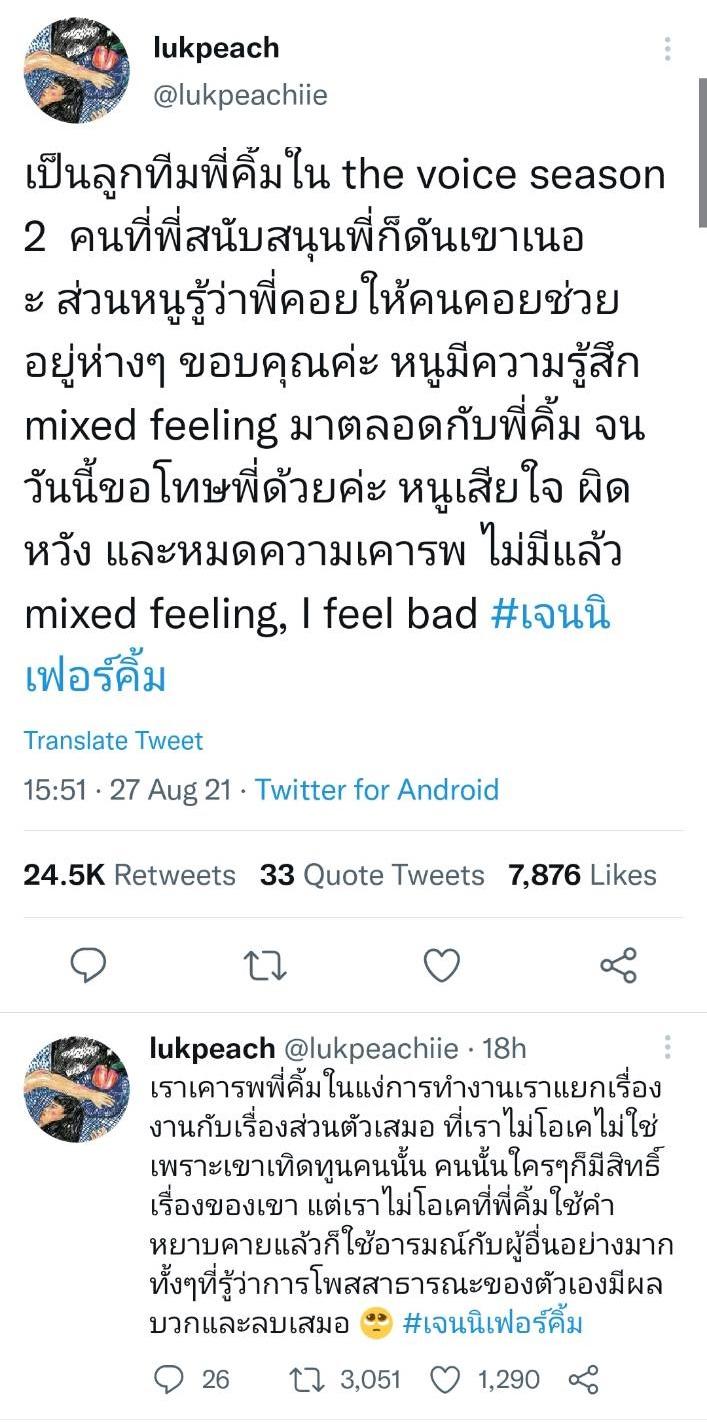 ล่าสุด ลูกพีช รพีพร ตันตระกูล หรือ ลูกพีช เดอะวอยซ์ ซึ่งเป็นลูกทีมของเจนนิเฟอร์ คิ้ม เมื่อตอนประกวดรายการ The Voice Thailand Season 2 ก็ได้ทวีตข้อความแสดงความคิดเห็นถึงเรื่องนี้ไว้ว่า “เป็นลูกทีมพี่คิ้มใน the voice season 2 คนที่พี่สนับสนุนพี่ก็ดันเขาเนอะ ส่วนหนูรู้ว่าพี่คอยให้คนคอยช่วยอยู่ห่างๆ ขอบคุณค่ะ หนูมีความรู้สึก mixed feeling มาตลอดกับพี่คิ้ม จนวันนี้ขอโทษพี่ด้วยค่ะ หนูเสียใจ ผิดหวัง และหมดความเคารพ ไม่มีแล้ว mixed feeling, I feel bad #เจนนิเฟอร์คิ้ม”
