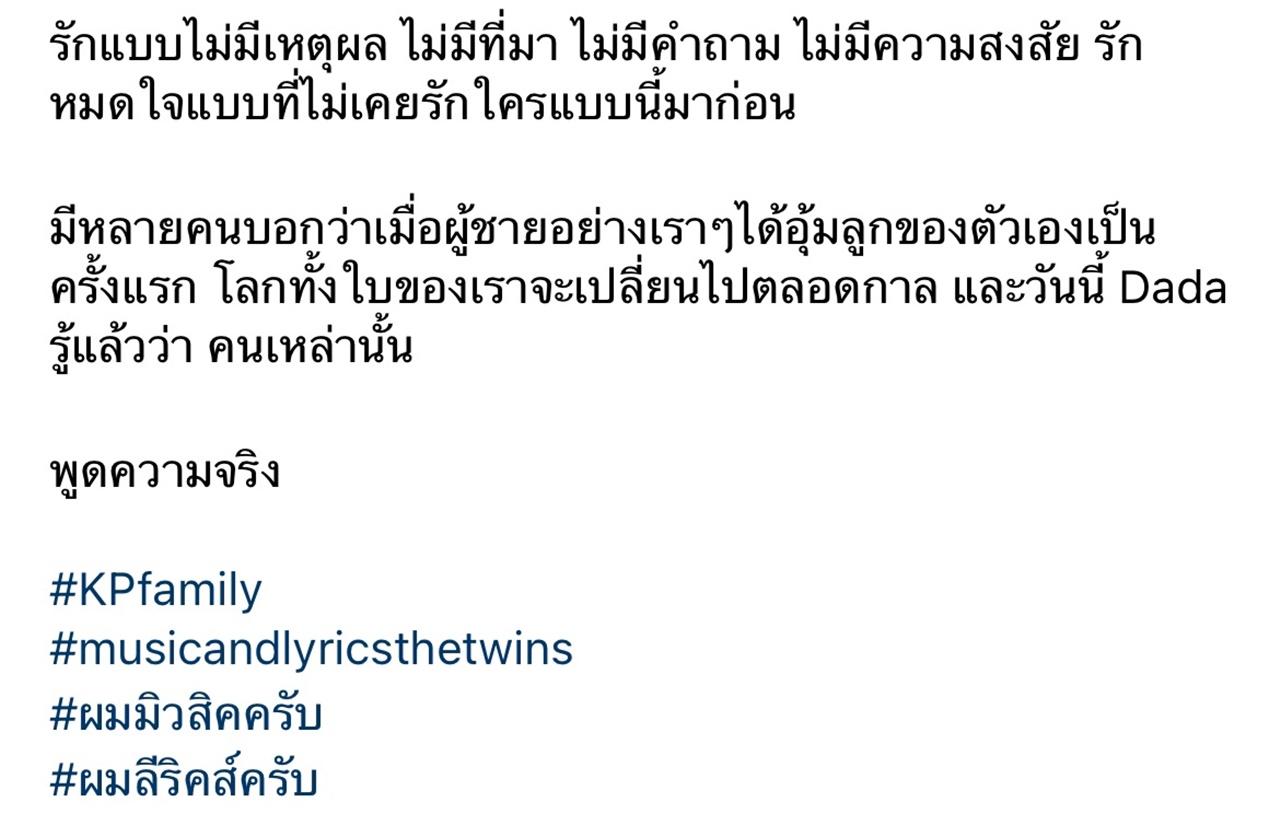 มีหลายคนบอกว่าเมื่อผู้ชายอย่างเราๆ ได้อุ้มลูกของตัวเองเป็นครั้งแรก โลกทั้งใบของเราจะเปลี่ยนไปตลอดกาล และวันนี้ Dada รู้แล้วว่า คนเหล่านั้น พูดความจริง #KPfamily #musicandlyricsthetwins #ผมมิวสิคครับ #ผมลีริคส์ครับ”.