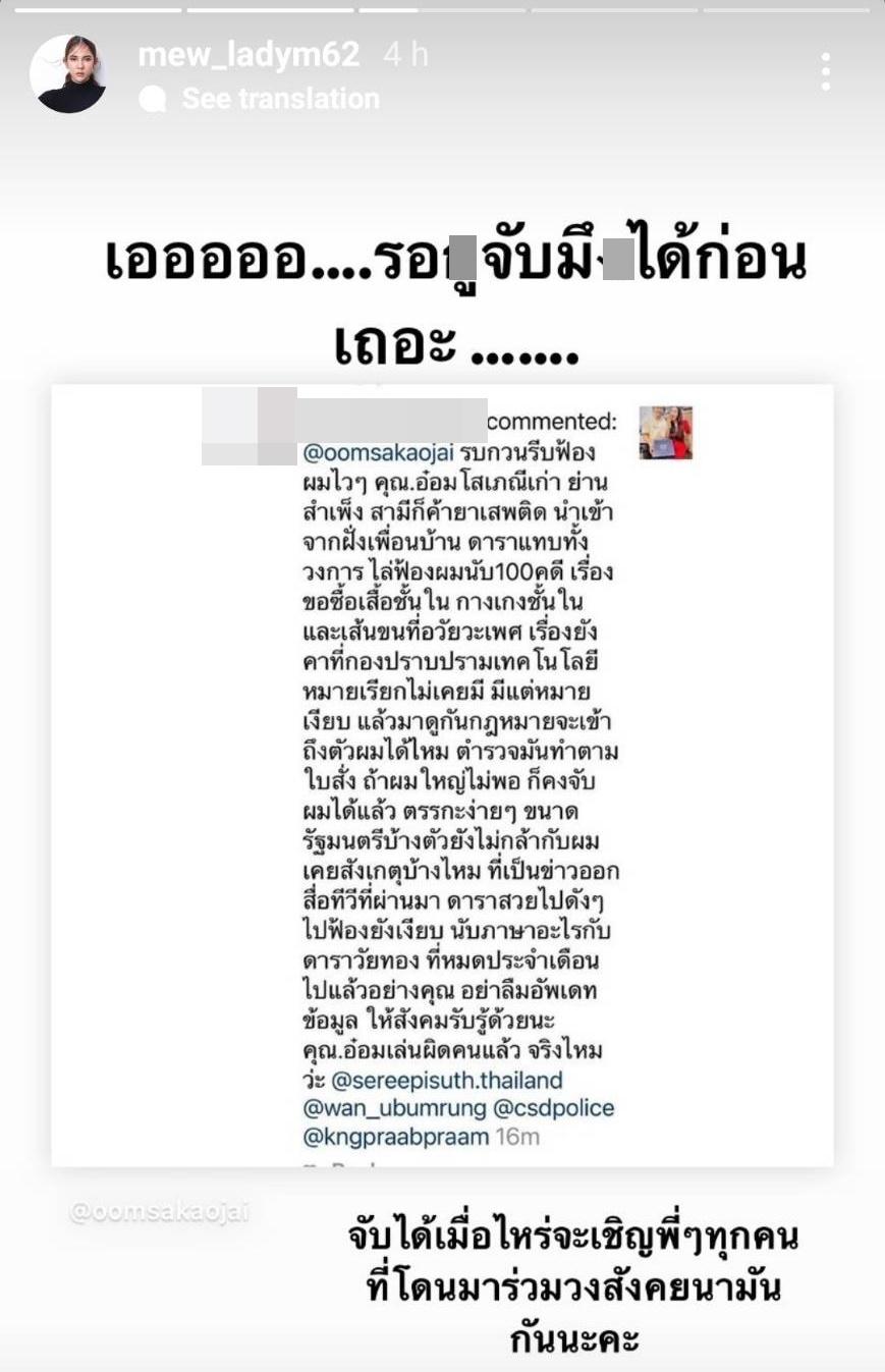 นอกจากนี้ หมิว สิริลภัส ยังแคปข้อความของชายคนหนึ่งที่คอมเมนต์คุกคามทางเพศถึงดาราสาวในวงการบันเทิงพร้อมทั้งท้าทายกฎหมาย และเขียนข้อความว่า “เอออออ.... รอ-ูจับมึ_ได้ก่อนเถอะ....... จับได้เมื่อไรจะเชิญพี่ๆ ทุกคนที่โดนมาร่วมวงสังคายนามันกันนะคะ” เรียกว่าเป็นการเอาคืนแบบแซ่บๆ ชนิดจัดหนักจากหมิว สิริลภัส แบบเต็มๆ เลยจ้า.