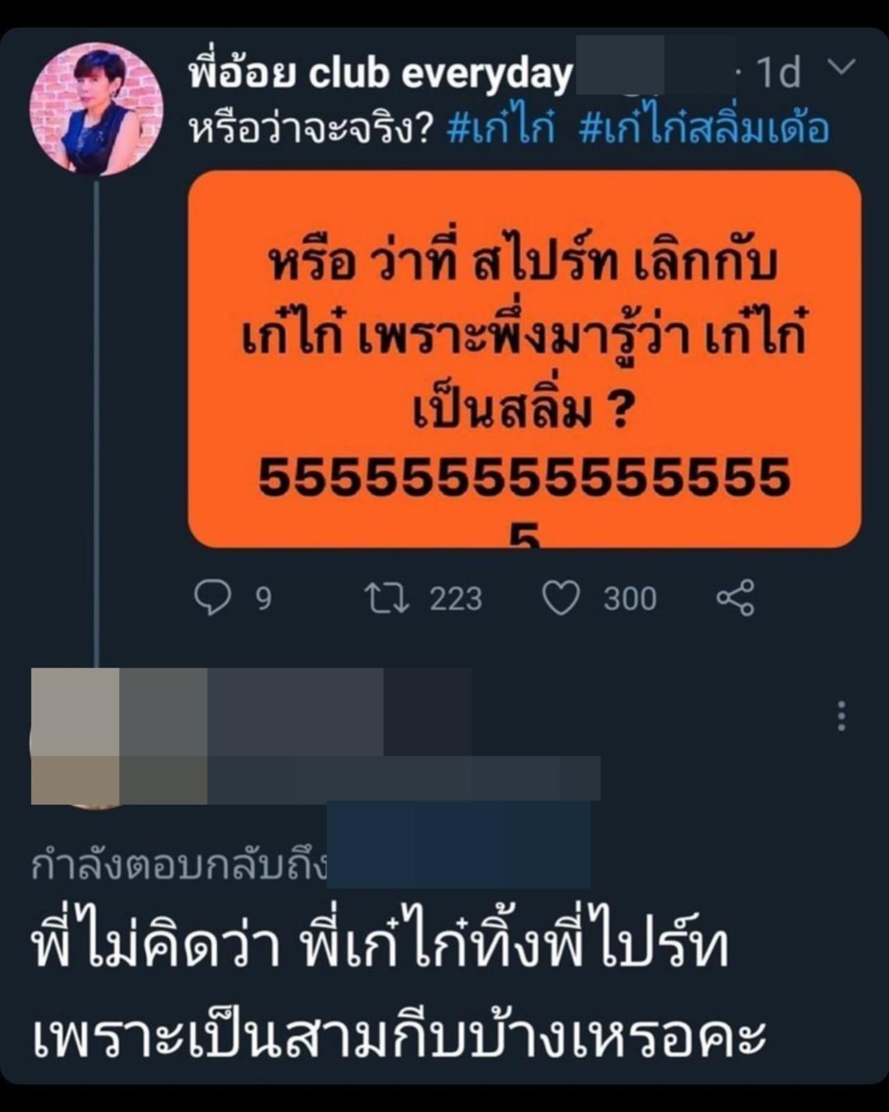 หลังจากที่เจ้าตัวทราบว่ามีคนใช้แอคเคาต์ทวิตเตอร์เป็นชื่อ พี่อ้อย club everday พร้อมกับรูปพี่อ้อยเป็นโปรไฟล์ และทวีตรูปข้อความว่า "หรือว่าที่สไปร์ทเลิกกับเก๋ไก๋ เพราะเพิ่งมารู้ว่าเก๋ไก๋เป็นสลิ่ม 55555" พร้อมกับทวีตข้อความว่า "หรือว่าจะจริง? #เก๋ไก๋ #เก๋ไก๋สลิ่มเด้อ"