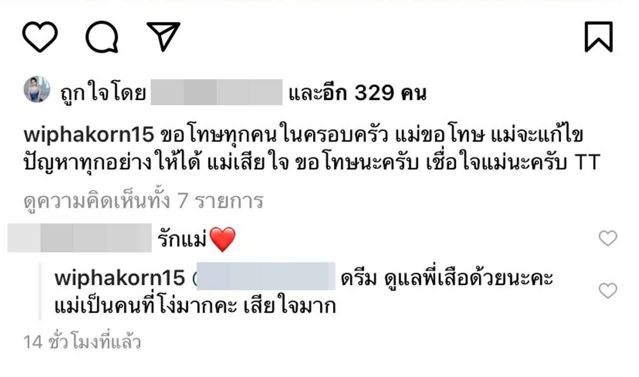 "ขอโทษทุกคนในครอบครัว แม่ขอโทษ แม่จะแก้ไขปัญหาทุกอย่างให้ได้ แม่เสียใจ ขอโทษนะครับ เชื่อใจแม่นะครับ TT"
