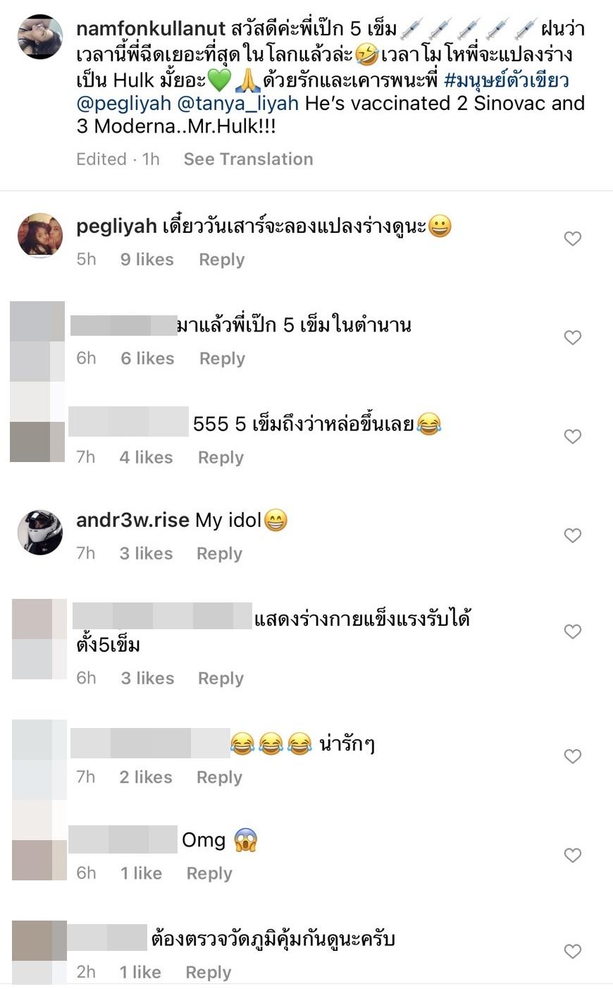 จากนั้นนักแสดงสาว น้ำฝน กุลณัฐ ซึ่งในตอนนี้ย้ายไปอยู่ที่ จ.ภูเก็ต โพสต์ภาพคู่กับเป๊ก พร้อมทั้งเขียนแคปชั่นแซวพี่ชายว่า “สวัสดีค่ะพี่เป๊ก 5 เข็ม ฝนว่าเวลานี้พี่ฉีดเยอะที่สุดในโลกแล้วล่ะ เวลาโมโหพี่จะแปลงร่างเป็น Hulk มั้ยอะ ด้วยรักและเคารพนะพี่ #มนุษย์ตัวเขียว @pegliyah @tanya_liyah He’s vaccinated 2 Sinovac and 3 Moderna..Mr.Hulk!!!”