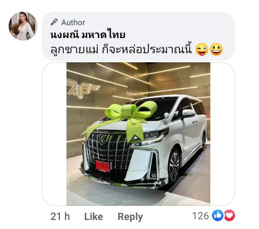 โดย จ๊ะ นงผณี โพสต์ภาพตัวเองกับรถคันใหม่ที่ถูกนำมาส่งถึงบ้าน ส่วนแคปชั่นน่าจะถูกใจคนรักการเสี่ยงโชค “พูดกันแต่เรา 1615 เบาได้เบา” อีกทั้งยังโพสต์ภาพรถตัวเองเพิ่มเติมในคอมเมนต์และเขียนข้อความว่า “ลูกชายแม่ ก็จะหล่อประมาณนี้”