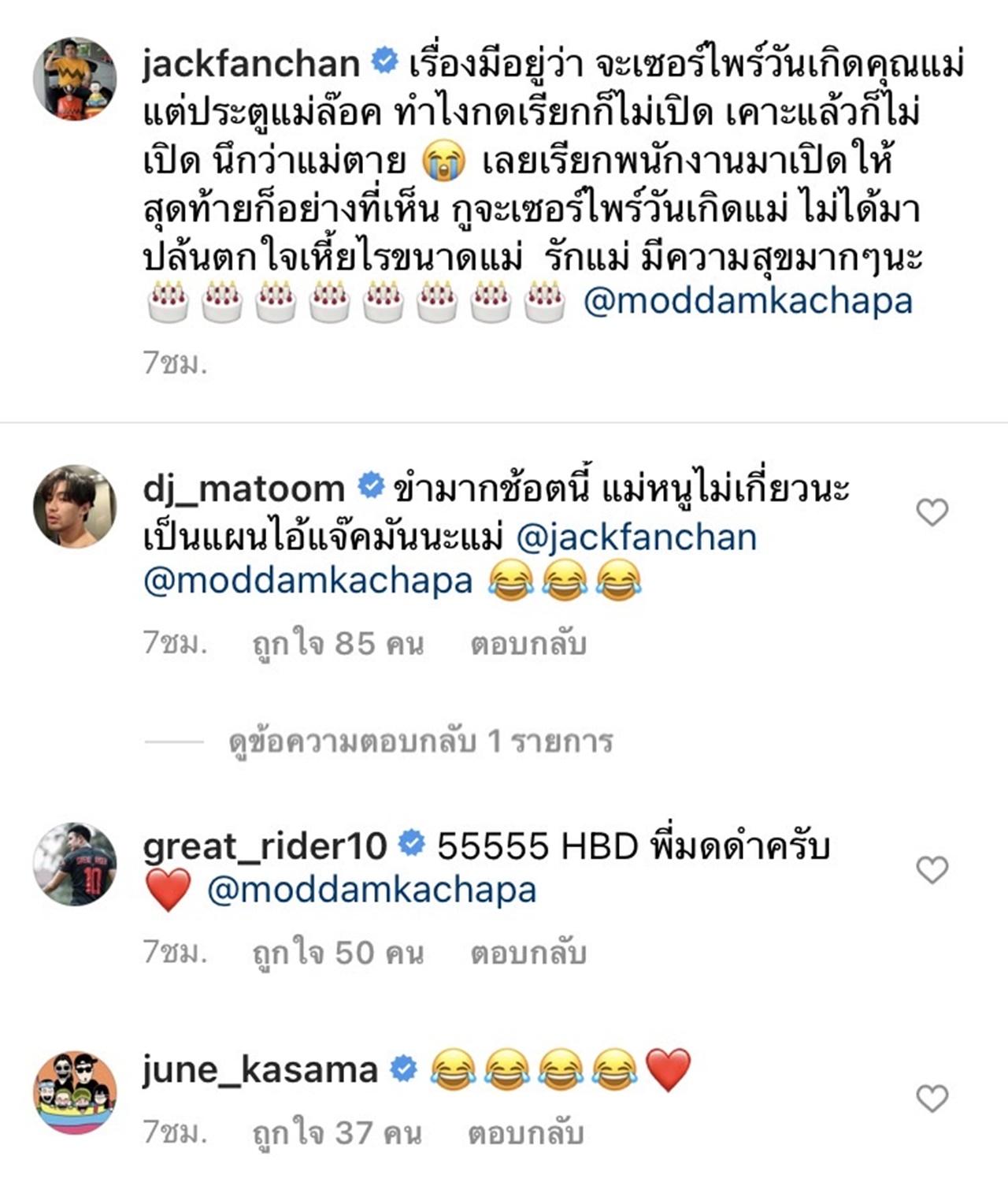 "เรื่องมีอยู่ว่า จะเซอร์ไพร์วันเกิดคุณแม่ แต่ประตูแม่ล๊อค ทำไงกดเรียกก็ไม่เปิด เคาะแล้วก็ไม่เปิด นึกว่าแม่ตาย เลยเรียกพนักงานมาเปิดให้ สุดท้ายก็อย่างที่เห็น กูจะเซอร์ไพร์วันเกิดแม่ ไม่ได้มาปล้นตกใจเหี้ยไรขนาดแม่ รักแม่ มีความสุขมากๆนะ @moddamkachapa"