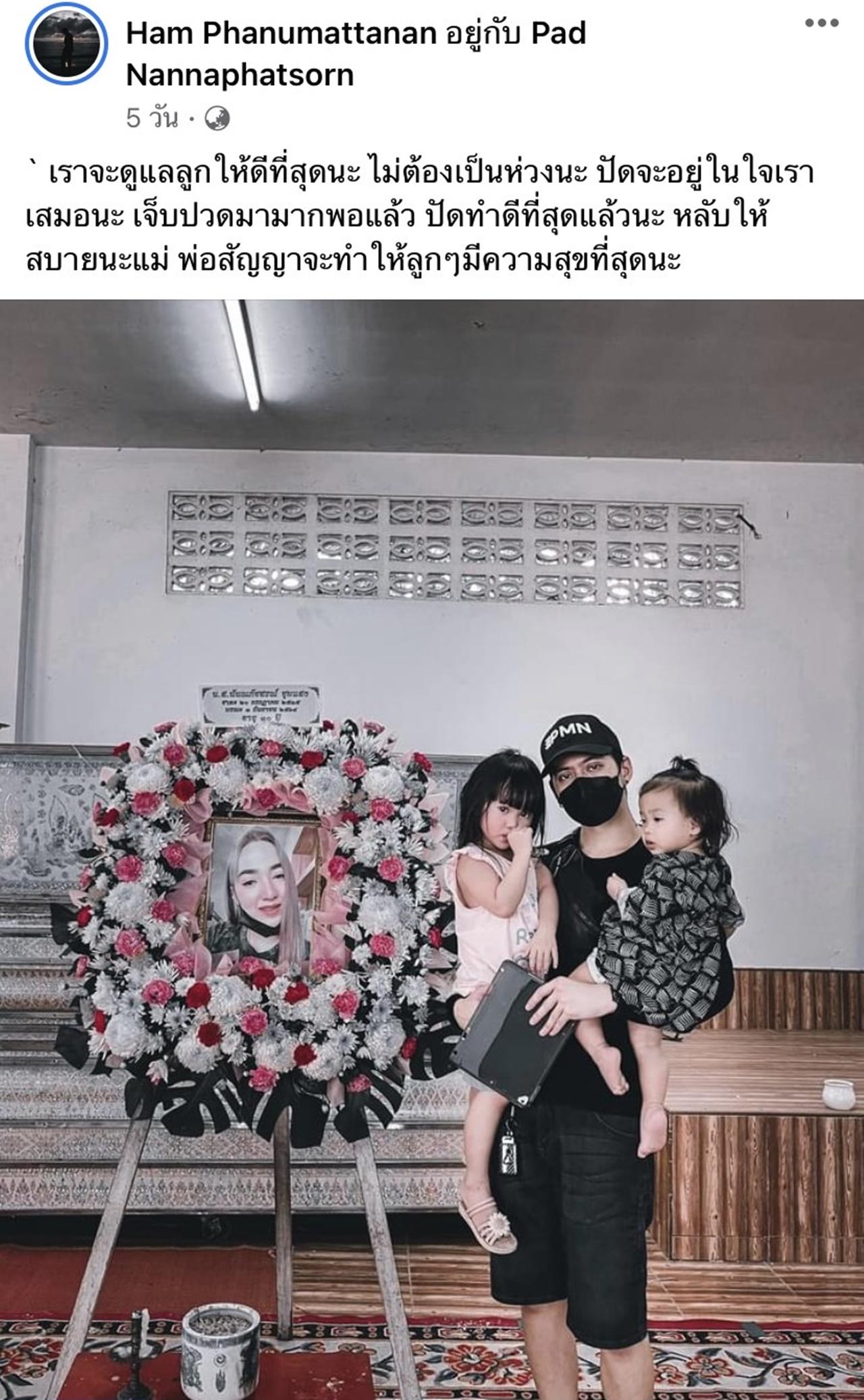 ซึ่งนักร้องหนุ่มได้โพสต์ภาพและข้อความว่า "เราจะดูแลลูกให้ดีที่สุดนะ ไม่ต้องเป็นห่วงนะ ปัดจะอยู่ในใจเราเสมอนะ เจ็บปวดมามากพอแล้ว ปัดทำดีที่สุดแล้วนะ หลับให้สบายนะแม่ พ่อสัญญาจะทำให้ลูกๆ มีความสุขที่สุดนะ"