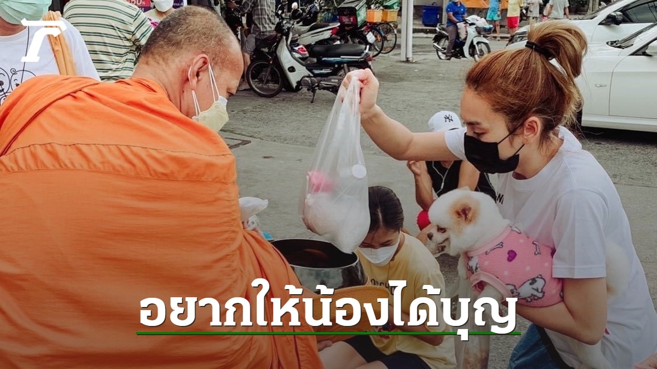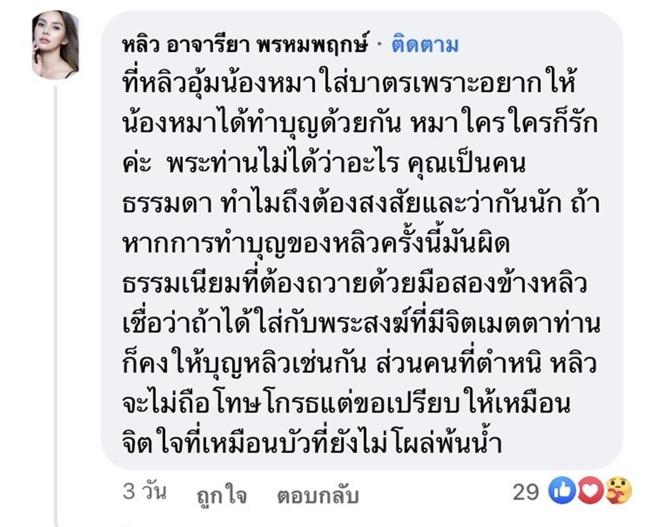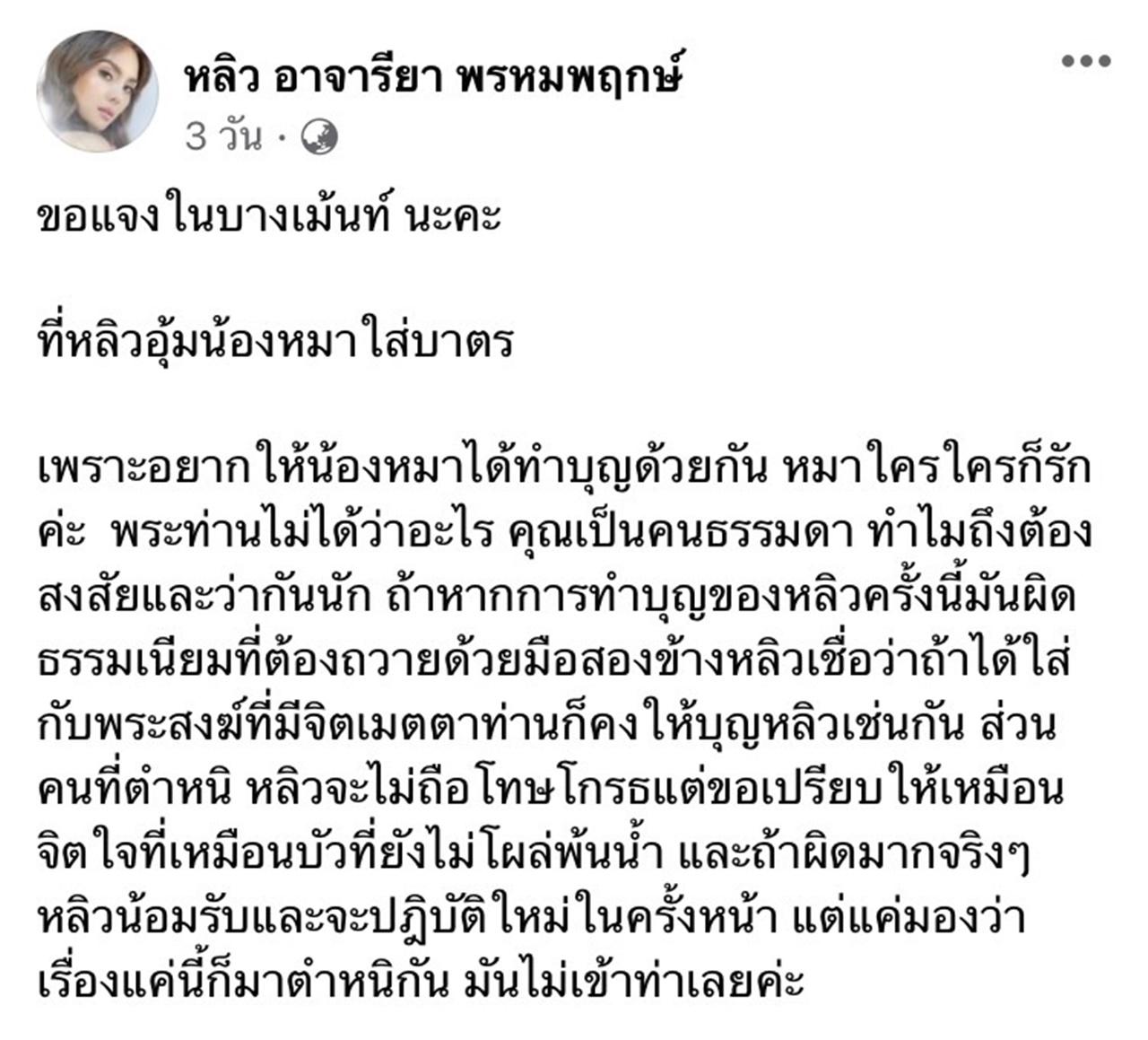 "ขอแจงในบางเม้นท์ นะคะ ที่หลิวอุ้มน้องหมาใส่บาตร เพราะอยากให้น้องหมาได้ทำบุญด้วยกัน หมาใครใครก็รักค่ะ พระท่านไม่ได้ว่าอะไร คุณเป็นคนธรรมดา ทำไมถึงต้องสงสัยและว่ากันนัก ถ้าหากการทำบุญของหลิวครั้งนี้มันผิดธรรมเนียมที่ต้องถวายด้วยมือสองข้าง