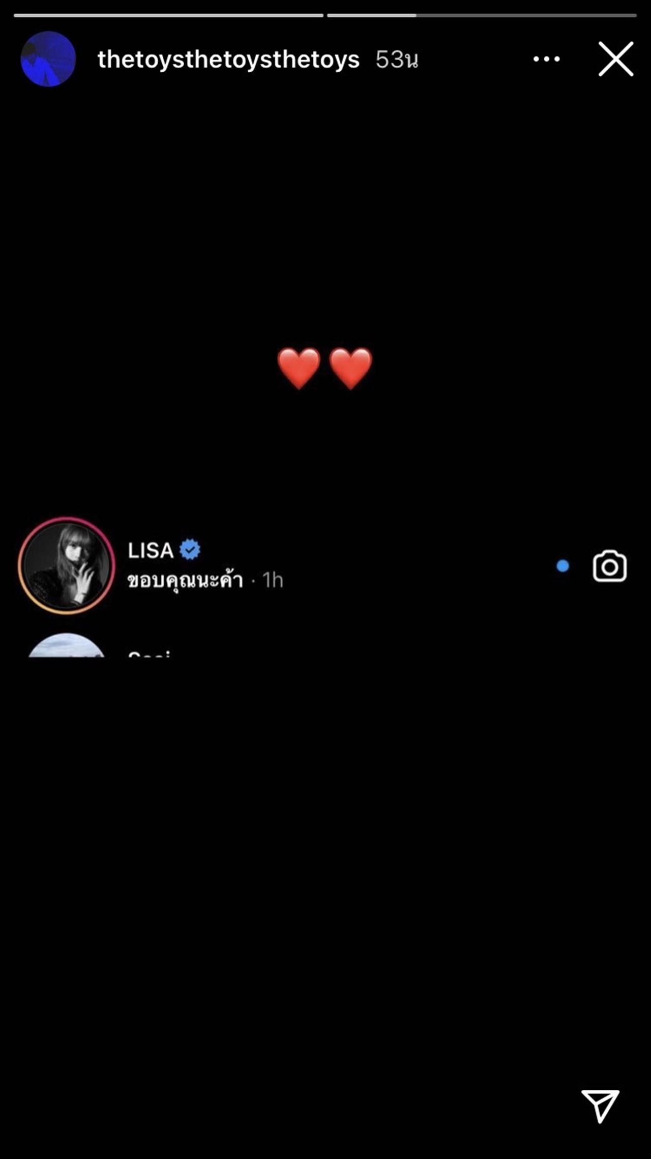 และคนที่ทำเอาแฟนๆ รู้สึกอิจฉาอย่างมากก็คือ เดอะทอยส์ ธันวา บุญสูงเนิน นักร้องหนุ่มชื่อดัง ที่ได้โพสต์เพลงใหม่ของ ลิซ่า ผ่านไอจีสตอรี่ พร้อมติดแท็กถึงเจ้าตัว และ ลิซ่า ก็ได้ตอบกลับโพสต์ดังกล่าวว่า "ขอบคุณนะค้า" งานนี้แฟนๆ ของลิซ่า ต่างบอกเป็นเสียงเดียวกันว่า อิจฉา เดอะทอยส์ อย่างมาก