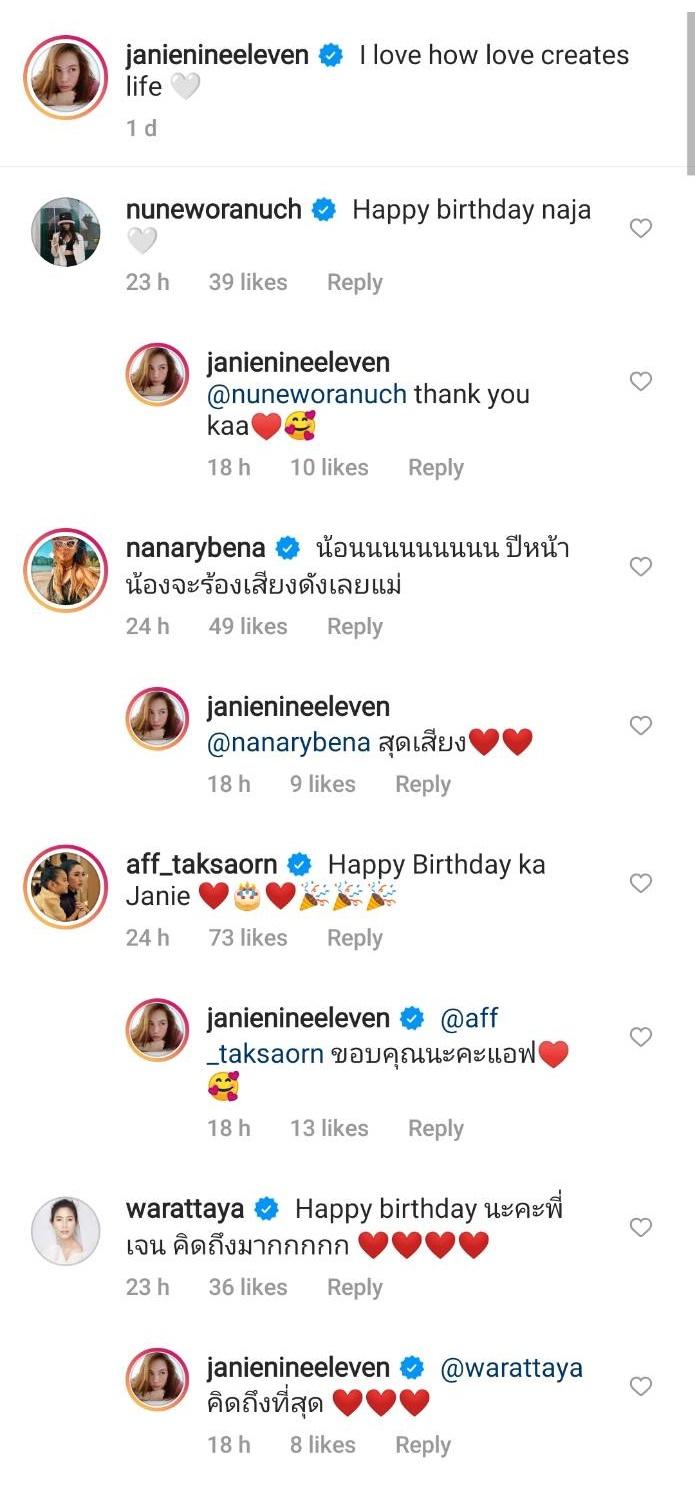 จากนั้นก็มีแฟนๆ รวมถึงเพื่อนๆ ในวงการต่างเข้ามาอวยพรวันเกิดให้เจนี่เต็มไอจี ด้านเพื่อนรักของเจนี่ นานา ไรบีนา ก็เข้ามาแซวความน่ารักของน้องโนล่าว่า “น้อนนนนนนนนน ปีหน้าน้องจะร้องเสียงดังเลยแม่” ก่อนที่เจนี่จะตอบกลับว่า “สุดเสียง” และใส่อีโมจิรูปหัวใจด้วย.