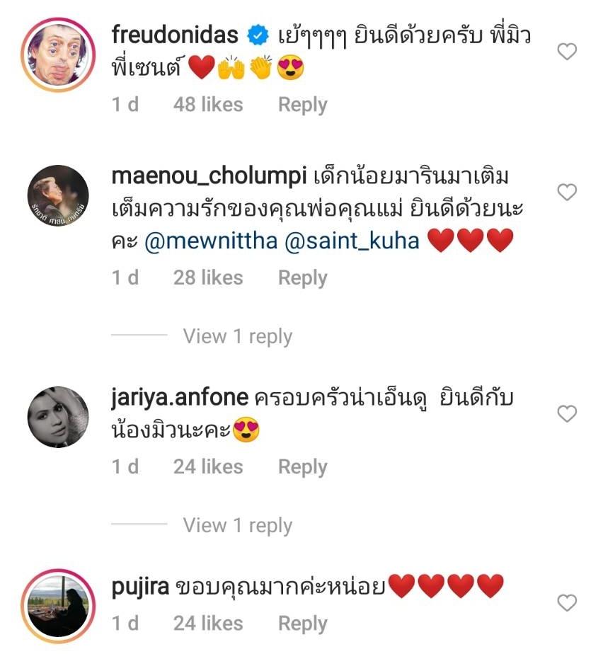 โดยมีแฟนๆ รวมถึงคนในวงการบันเทิงเข้ามาคอมเมนต์แสดงความยินดีหลายคน ด้านมิว นิษฐา ก็ได้เข้ามาคอมเมนต์ตอบกลับว่า “ขอบคุณค้าาพี่หน่อยยยย” รวมไปถึงคุณแม่ของมิวที่เข้ามาตอบว่า “ขอบคุณมากค่ะหน่อย”.