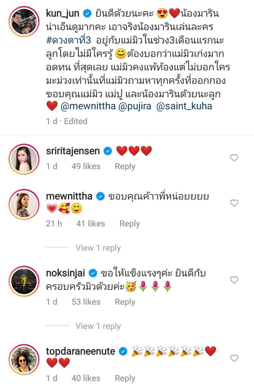 ล่าสุด หน่อย บุษกร ผู้จัดละคร “ดวงตาที่ 3” ทางช่อง 3 ที่มิวแสดงนำ ได้โพสต์ภาพร่วมยินดีกับมิวในไอจีส่วนตัว และเขียนข้อความเล่าถึงความลับในช่วงที่มิวถ่ายละครเรื่องนี้ไว้ว่า “ยินดีด้วยนะคะ น้องมารินน่าเอ็นดูมากค่ะ เอาจริงน้องมารินเล่นละคร #ดวงตาที่3 อยู่กับแม่มิวในช่วง 3 เดือนแรกนะลูกโดยไม่มีใครรู้ ต้องบอกว่าแม่มิวเก่งมาก อดทน ที่สุดเลย แม่มิวคงแพ้ท้องแต่ไม่บอกใคร มะม่วงเท่านั้นที่แม่มิวถามหาทุกครั้งที่ออกกอง ขอบคุณแม่มิว แม่ปู และน้องมารินด้วยนะลูก @mewnittha @pujira @saint_kuha”