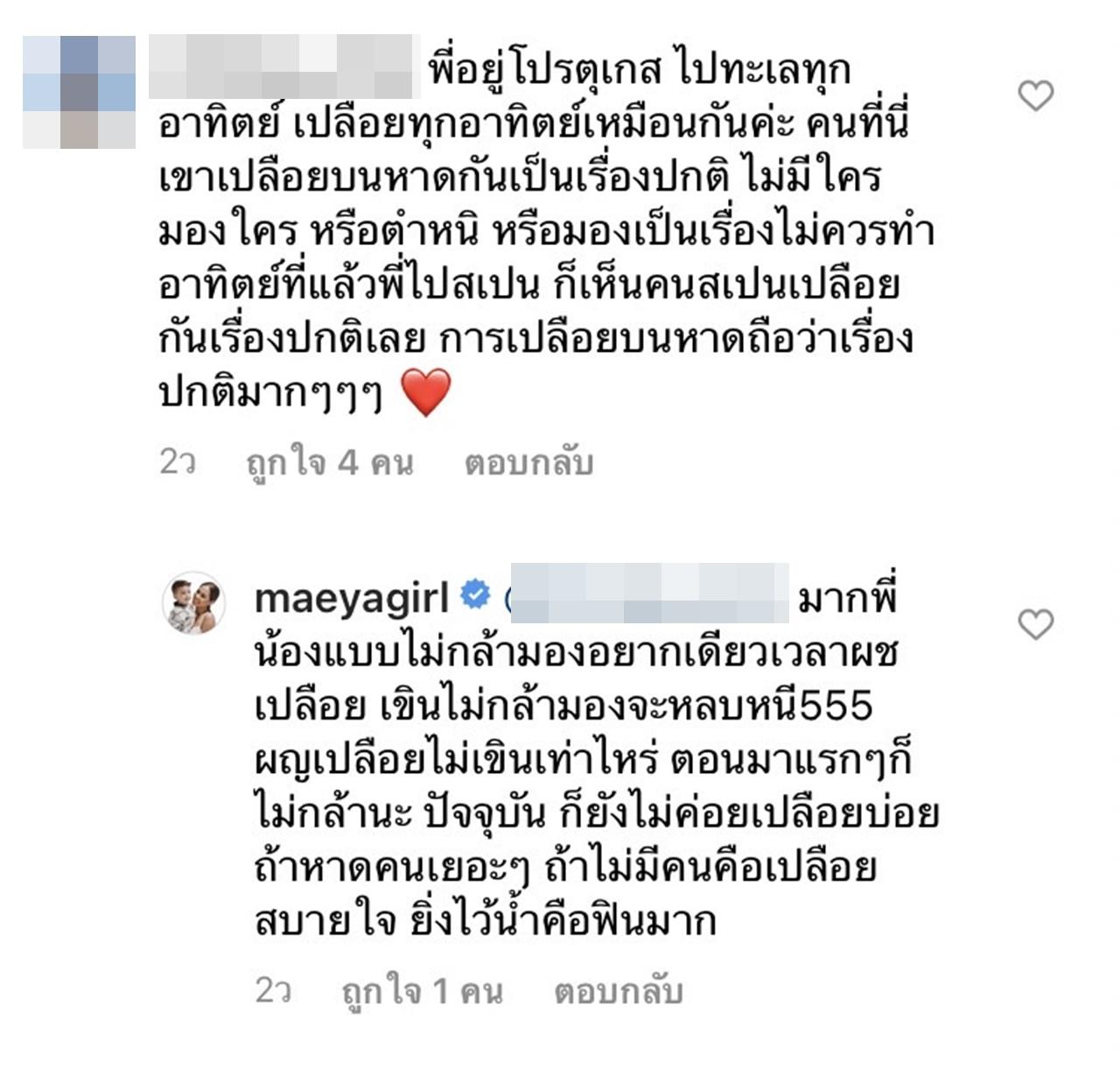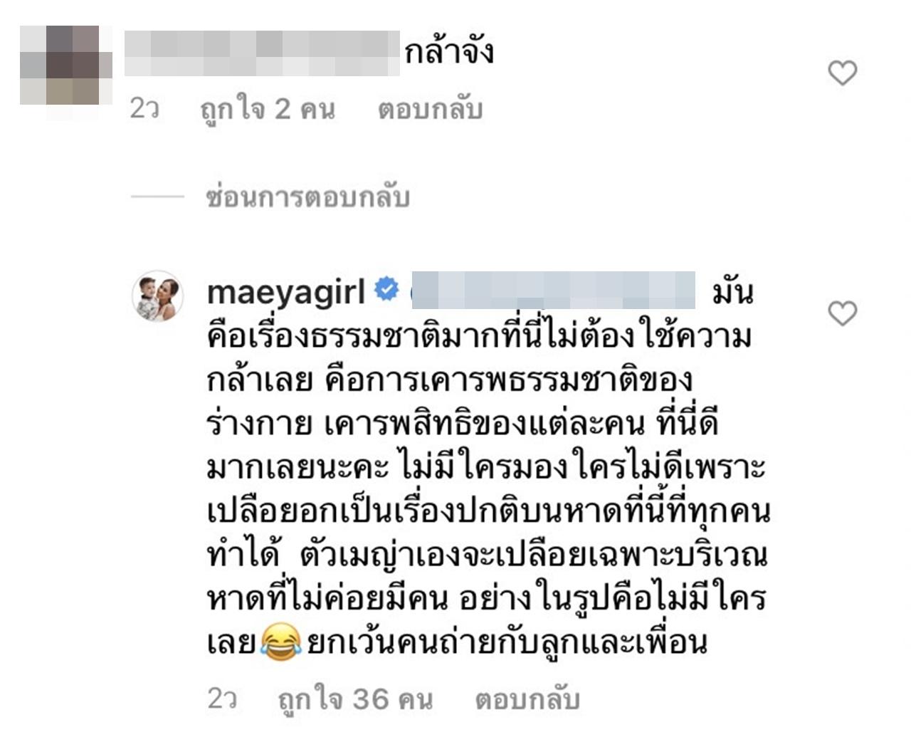 และ เมญ่า ก็ไม่รอช้า ได้เข้ามาตอบกลับว่า "มันคือเรื่องธรรมชาติมากที่นี่ไม่ต้องใช้ความกล้าเลย คือการเคารพธรรมชาติของร่างกาย เคารพสิทธิของแต่ละคน ที่นี่ดีมากเลยนะคะ ไม่มีใครมองใครไม่ดีเพราะเปลือยอกเป็นเรื่องปกติบนหาดที่นี่ที่ทุกคนทำได้ ตัวเมญ่าเองจะเปลือยเฉพาะบริเวณหาดที่ไม่ค่อยมีคน อย่างในรูปคือไม่มีใครเลย ยกเว้นคนถ่ายกับลูกและเพื่อน"