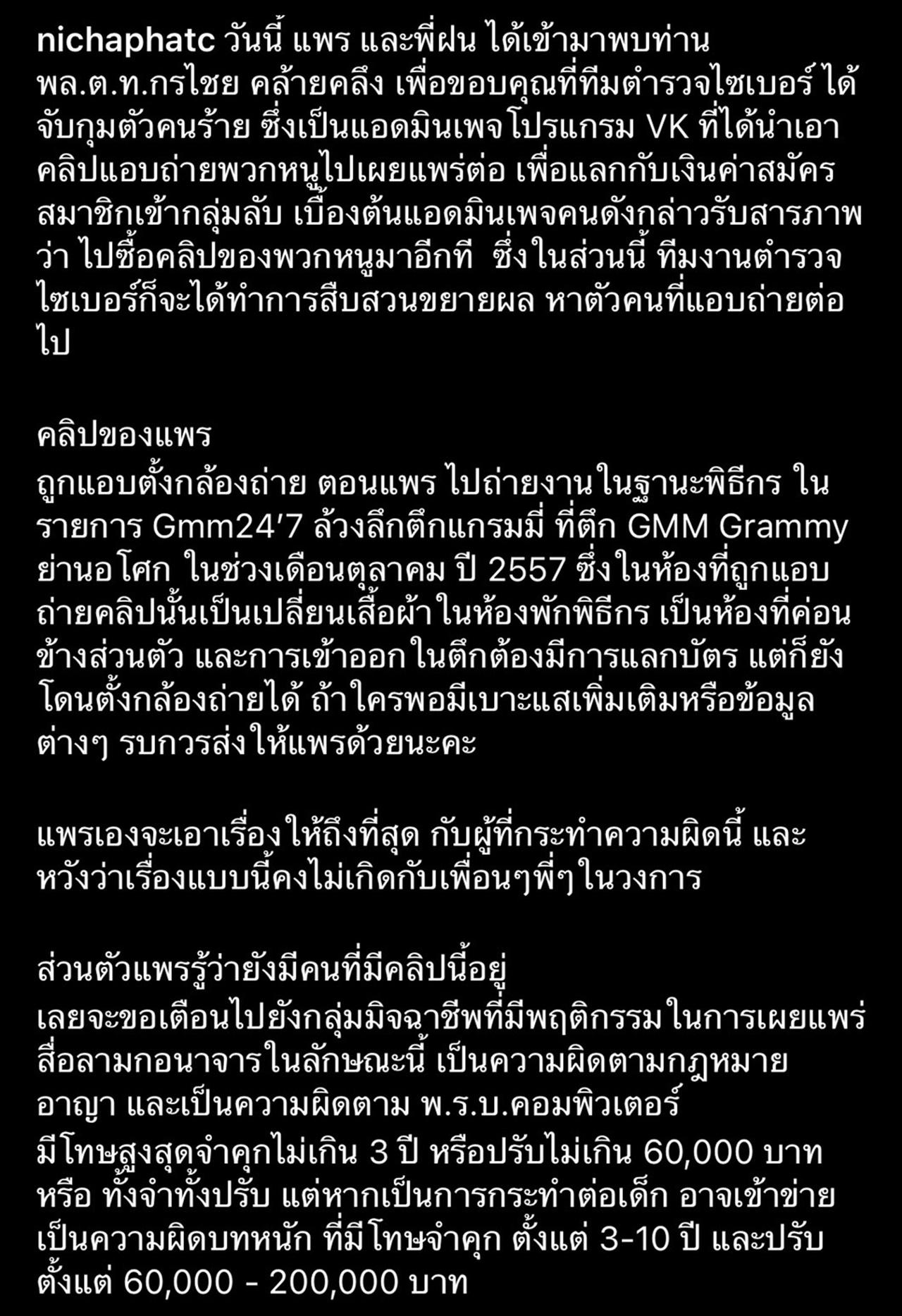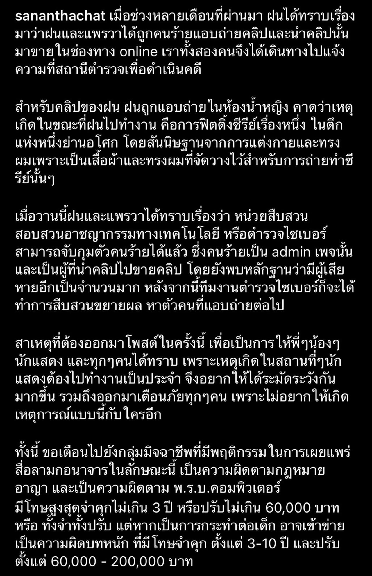 2 นักแสดงสาว แพรวา ณิชาภัทร และ ฝน ศนันธฉัตร ได้โพสต์ภาพขณะเข้าพบเจ้าหน้าที่หน่วยสืบสวนสอบสวนอาชญากรรมทางเทคโนโลยี หลังจากที่จับกุมคนร้ายที่เป็นแอดมินเพจเผยแพร่คลิปของทั้งคู่ตอนที่ถูกตั้งกล้องแอบถ่ายขณะเข้าห้องน้ำ รวมถึงเปลี่ยนเสื้อผ้าในตึกดัง