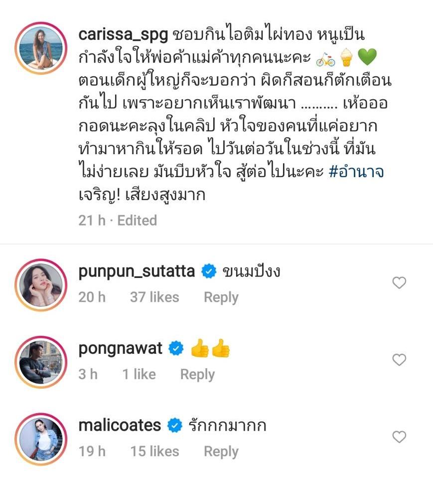 ล่าสุด นักแสดง-นางแบบสาว คารีสา สปริงเก็ตต์ ก็ได้โพสต์ภาพตัวเองนั่งอยู่บนรถเข็นขายไอศกรีม พร้อมทั้งเขียนข้อความให้กำลังใจพ่อค้าแม่ค้าว่า “ชอบกินไอติมไผ่ทอง หนูเป็นกำลังใจให้พ่อค้าแม่ค้าทุกคนนะคะ ตอนเด็กผู้ใหญ่ก็จะบอกว่า ผิดก็สอนก็ตักเตือนกันไป เพราะอยากเห็นเราพัฒนา ………. เห้อออ กอดนะคะลุงในคลิป หัวใจของคนที่แค่อยากทำมาหากินให้รอด ไปวันต่อวันในช่วงนี้ ที่มันไม่ง่ายเลย มันบีบหัวใจ สู้ต่อไปนะคะ #อำนาจ เจริญ! เสียงสูงมาก”