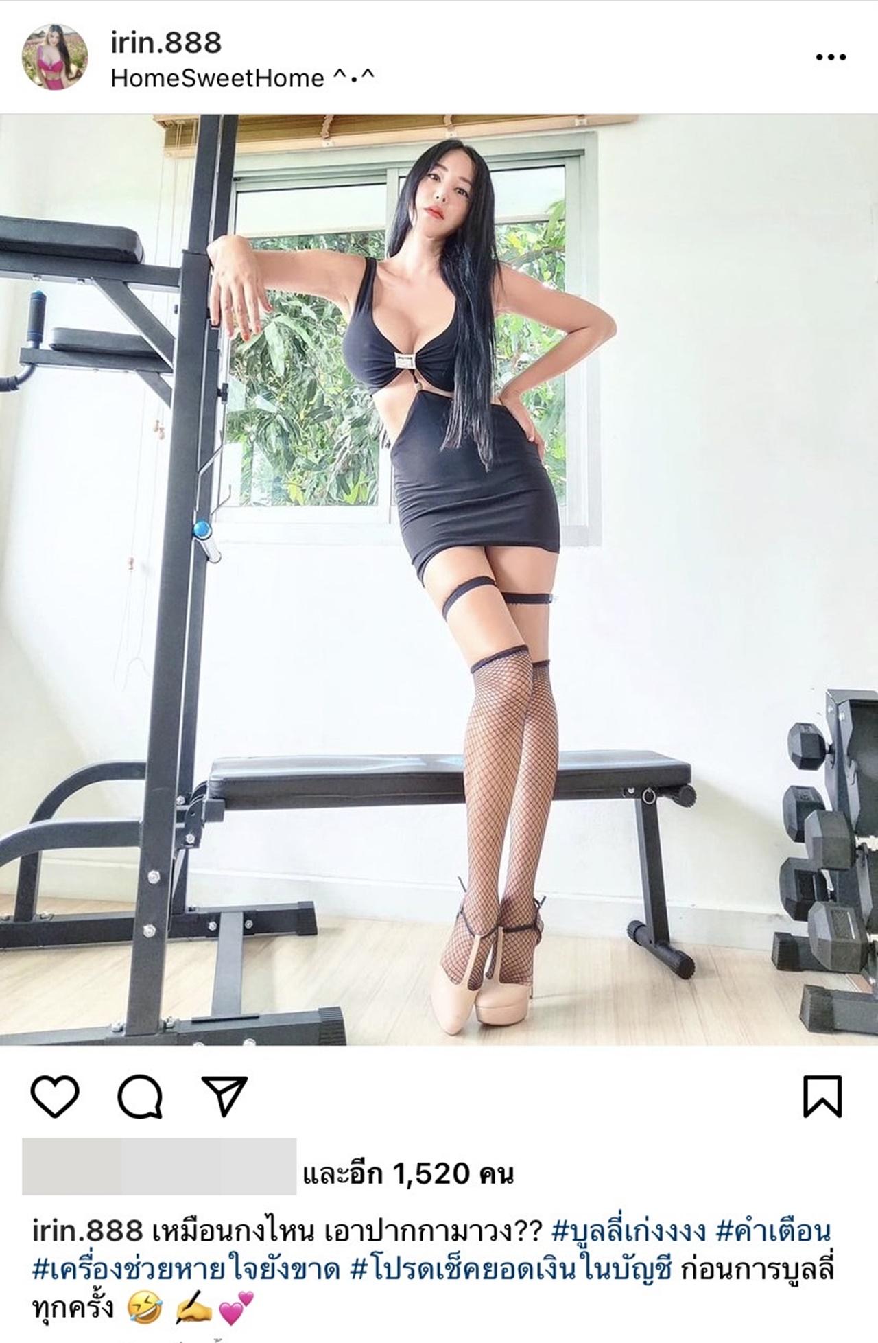 โดย เปิ้ล ไอริณ ได้ใส่ชุดเดรสรัดรูปสีดำสุดเซ็กซี่ พร้อมกับเขียนแคปชั่นว่า "เหมือนกงไหน เอาปากกามาวง?? #บูลลี่เก่งงงง #คำเตือน #เครื่องช่วยหายใจยังขาด #โปรดเช็คยอดเงินในบัญชี ก่อนการบูลลี่ทุกครั้ง"