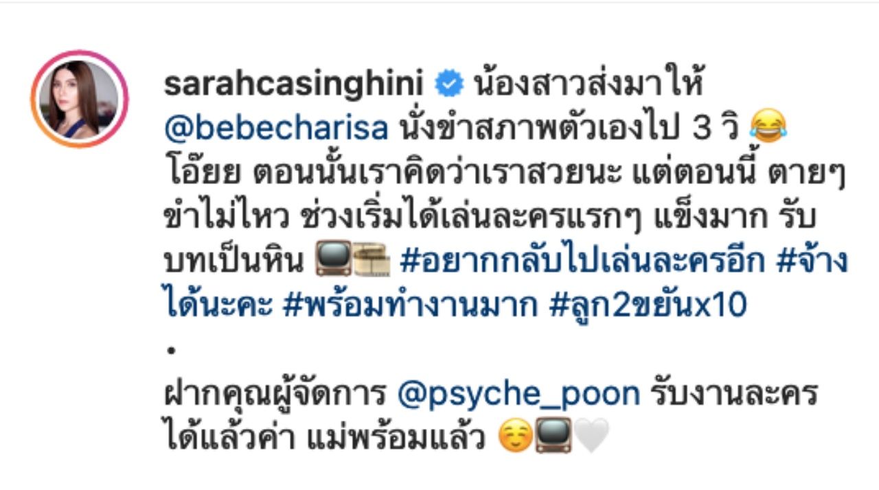 งานในวงการบันเทิง ไม่ทิ้งนะจ๊ะ ยังๆ ยังรับเล่นอยู่ โดยซาร่าโพสต์ไอจีแจ้งไว้ว่า น้องสาวส่งมาให้ @bebecharisa นั่งขำสภาพตัวเองไป 3 วิ โอ๊ยย ตอนนั้นเราคิดว่าเราสวยนะ แต่ตอนนี้ ตายๆ ขำไม่ไหว ช่วงเริ่มได้เล่นละครแรกๆ แข็งมาก รับบทเป็นหิน อยากกลับไปเล่นละครอีก #จ้างได้นะคะ #พร้อมทำงานมาก #ลูก 2 ขยัน x 10 ฝากคุณผู้จัดการ @psyche_poon รับงานละครได้แล้วค่า แม่พร้อมแล้ว